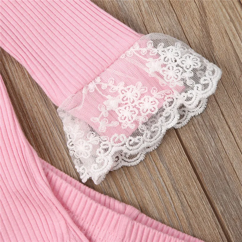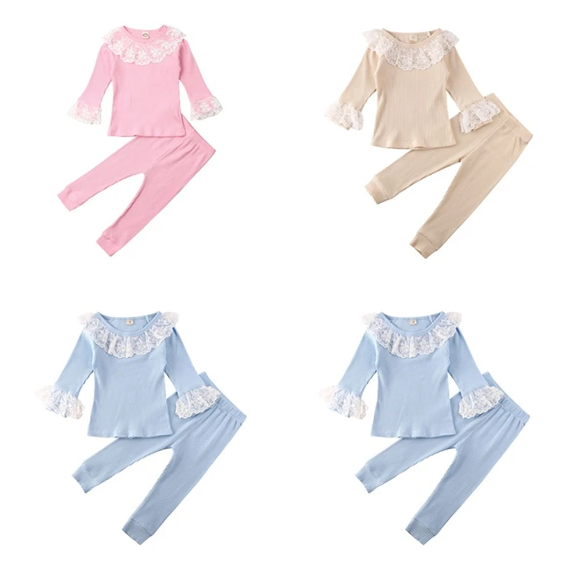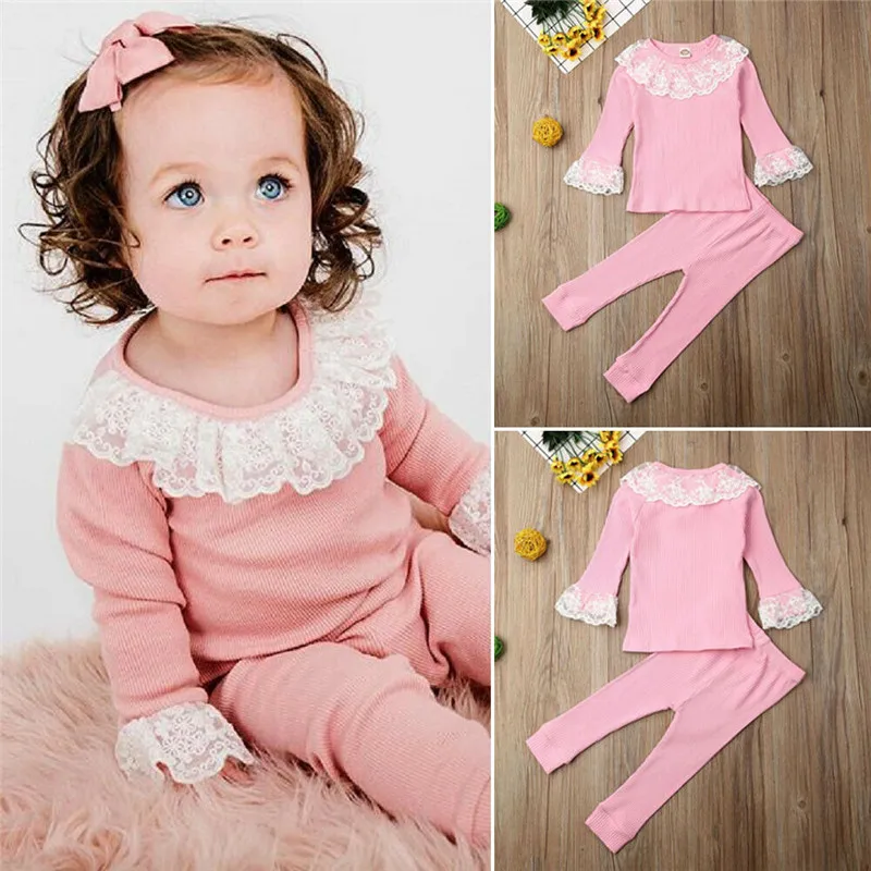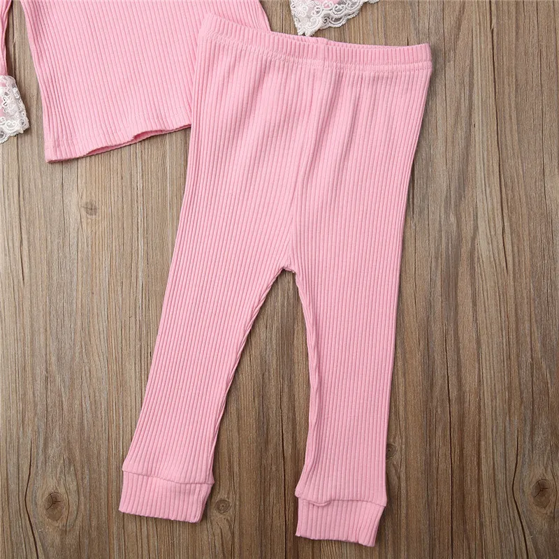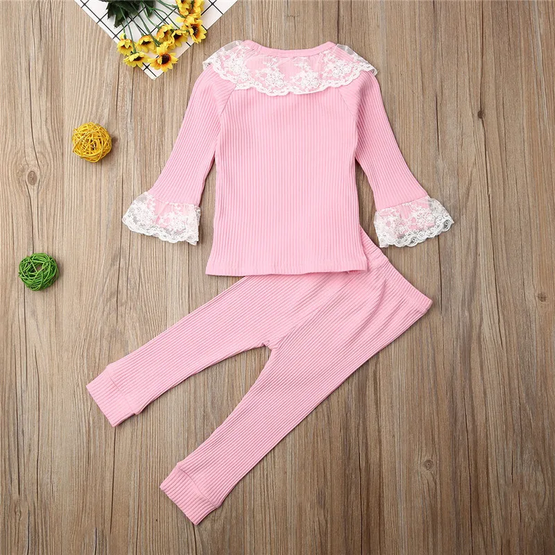 В 2019 году, новый осенний кружевной комплект принцессы из 2 предметов: футболки с длинными рукавами топ и брюки-леггинсы повседневная одежда для маленьких девочек