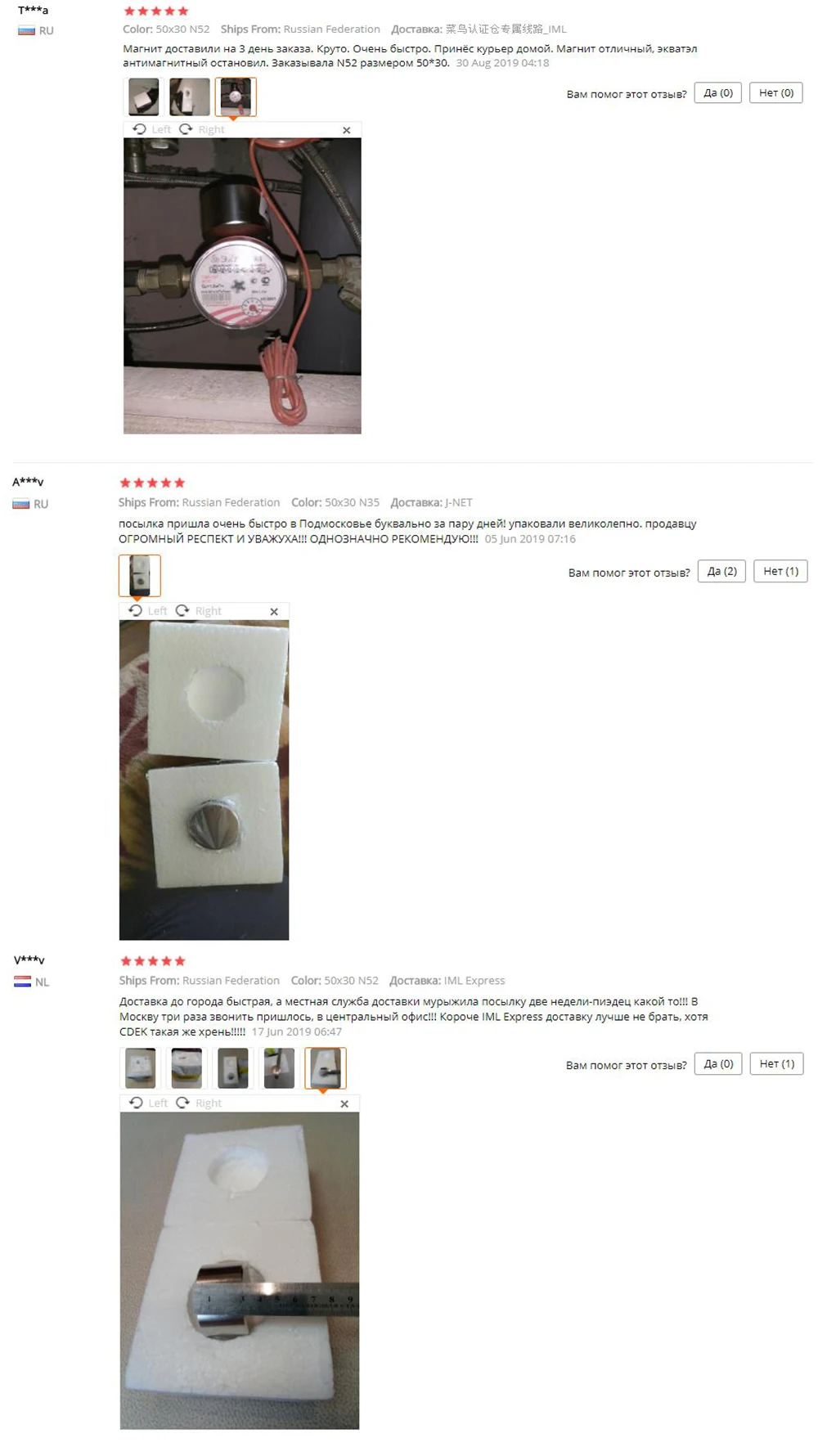 Магнит 50x30 мм, N40. Счетчики "Тайпит ОХТА" останавливает без проблем, "ЭКО НОМ СВ-15-110" замедляет, но полностью остановить не удалось. Заказ был отправлен через 12 дн. после оплаты, доставка в областной центр РФ заняла ещё 50 дн. , итого: 2 мес. (при том, что все остальные товары, купленные у других продавцов в тот же день, дошли за 2-3 недели). Отправление путешествовало через Казахстан, было доставлено в офис СДЭК. Упаковано ответственно: в куб из пенопласта (см. фото 1) и полиэтиленовый пакет.