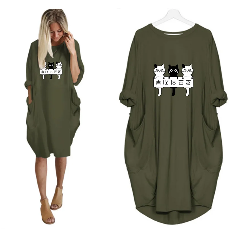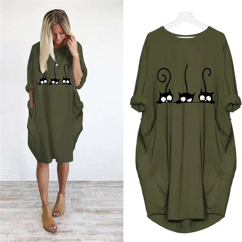 Платье женское средней длины с принтом милого кота, винтажный Повседневный Сарафан свободного кроя с карманами, для вечеринки, осень 2021
