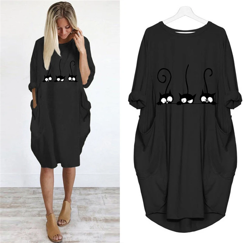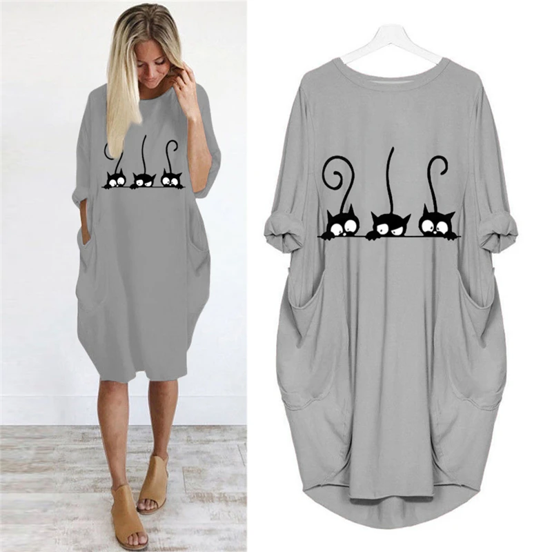 Женское винтажное платье макси, повседневное свободное платье с принтом кота и карманами, новинка размера плюс