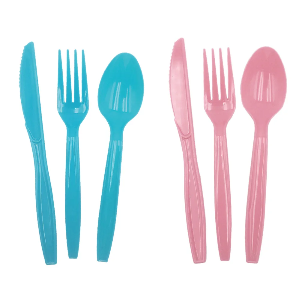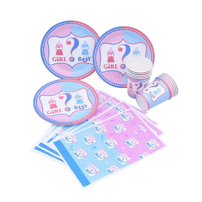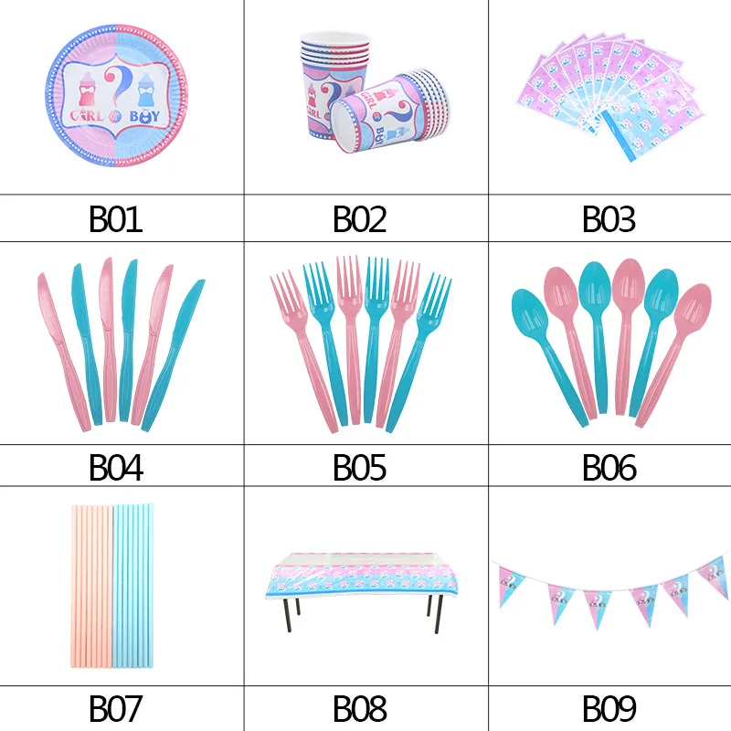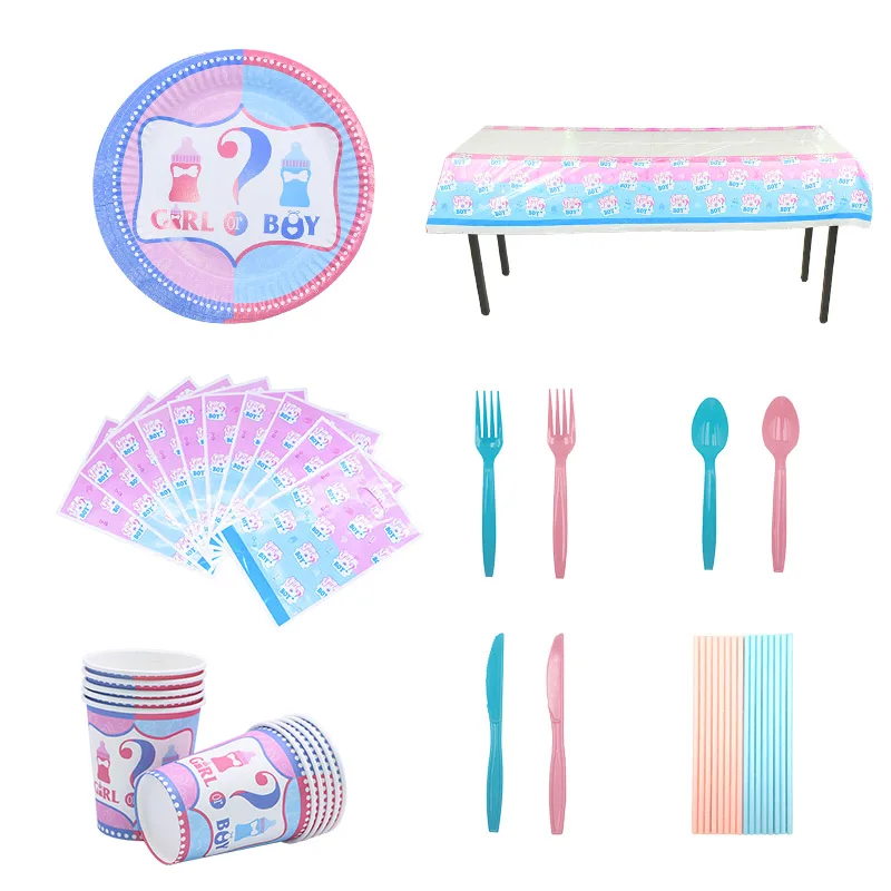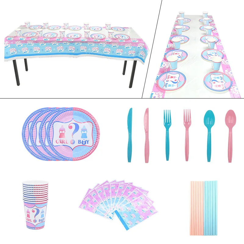 Gender reveal party tableware setplates,cups,candy bag,knives,forks,spoons,straws,tablecloth,banner