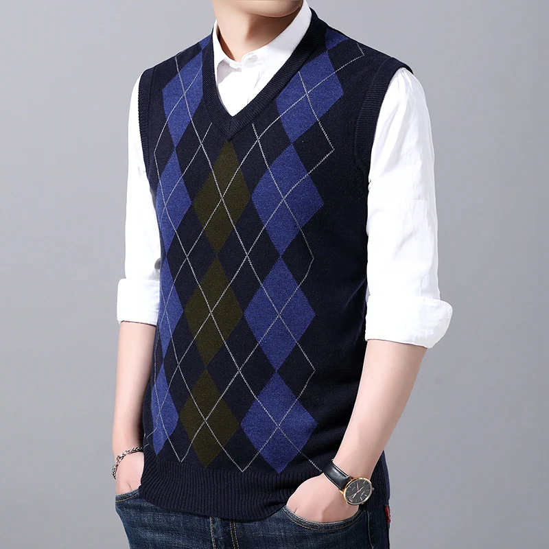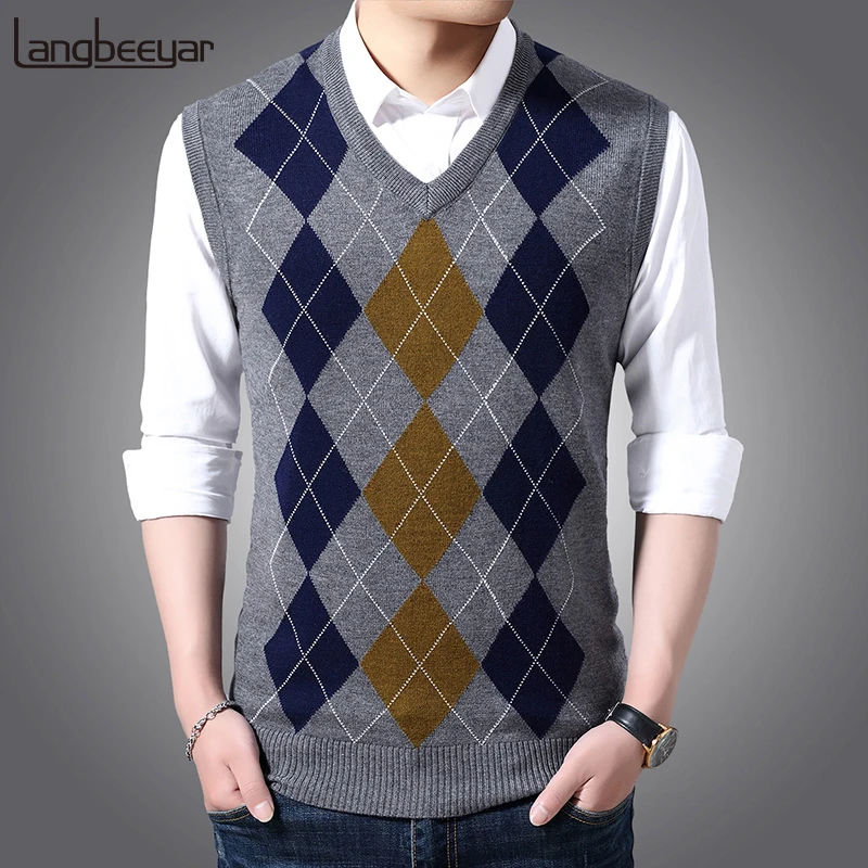 Новый модный брендовый свитер без рукавов, мужской пуловер, жилет с v-образным вырезом, Облегающие джемперы, вязаные узоры, осенняя повседневная одежда для мужчин
