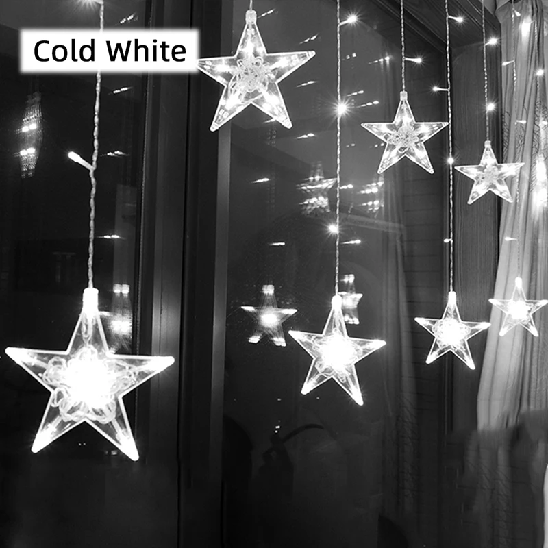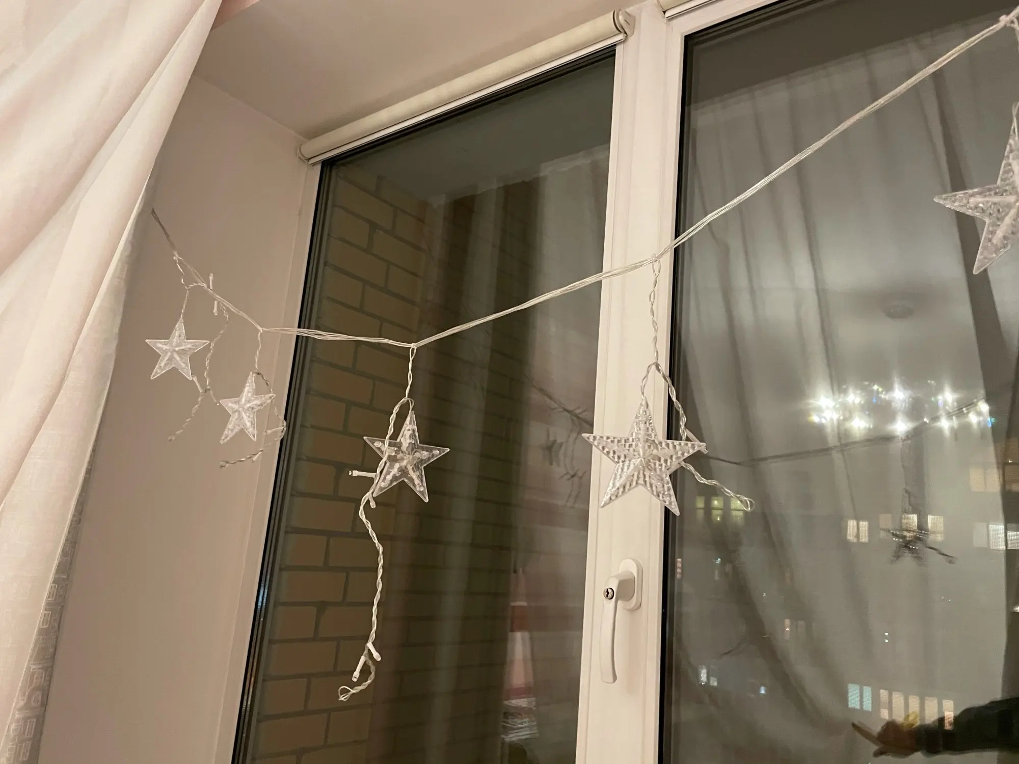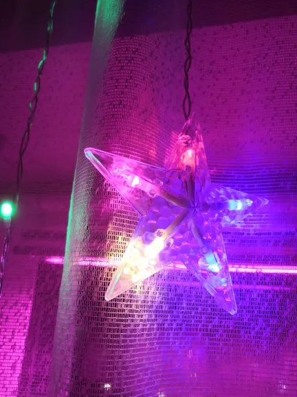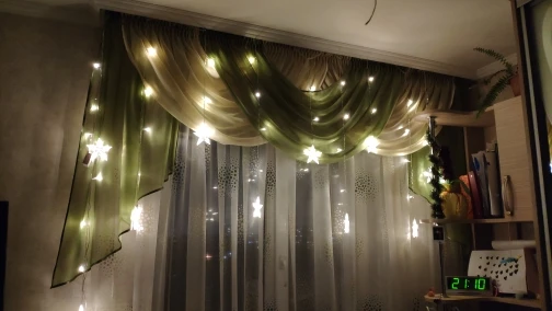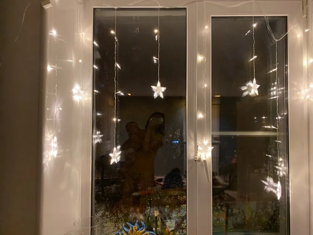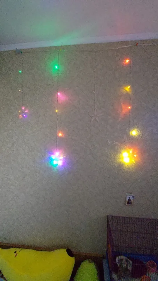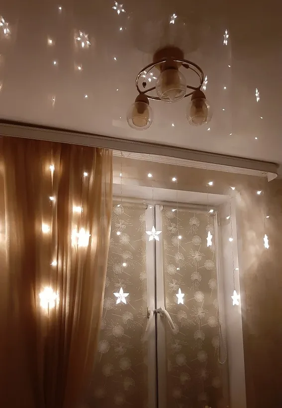 Хороши очень звёздочки, единственное, надо учитывать, что провод довольно короткий, у розетки на карниз без шаманства не повесить. А так все отлично, несколько режимов мерцания, разветвления проводов на стяжках.
