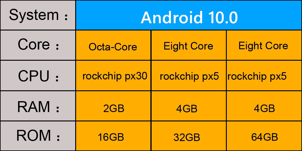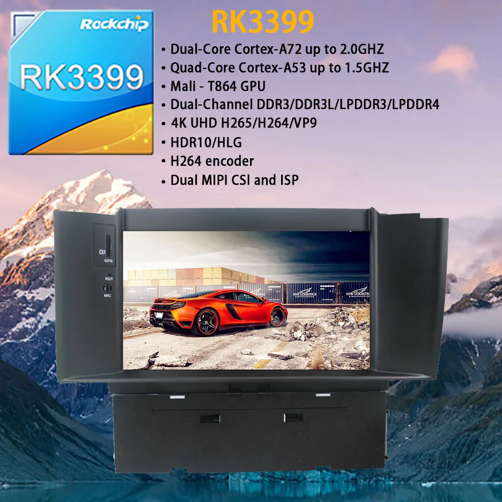 Android 10,0 RAM:4 Гб RAM:64 ГБ Rockchip PX6(RK3399) шесть ядер Двойной Cortex-A72 (1,8 ГГц) Quad Cortex-A53 (1,4 ГГц) Чип усилителя: TDA7851 Радио тюнер IC:NXP 6686