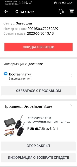 Товар я не получил, вернула торможения. Открыл спор, продавец молодец сразу вернул деньги, за это ставлю пять звёзд.