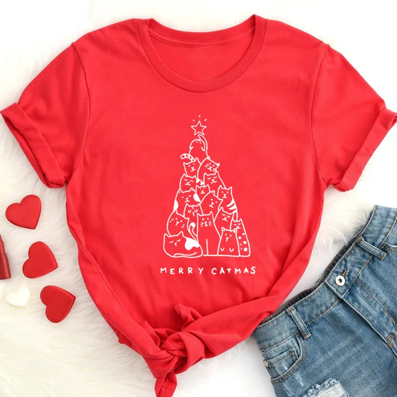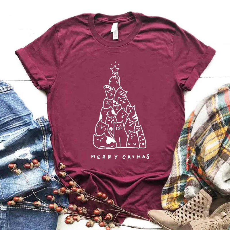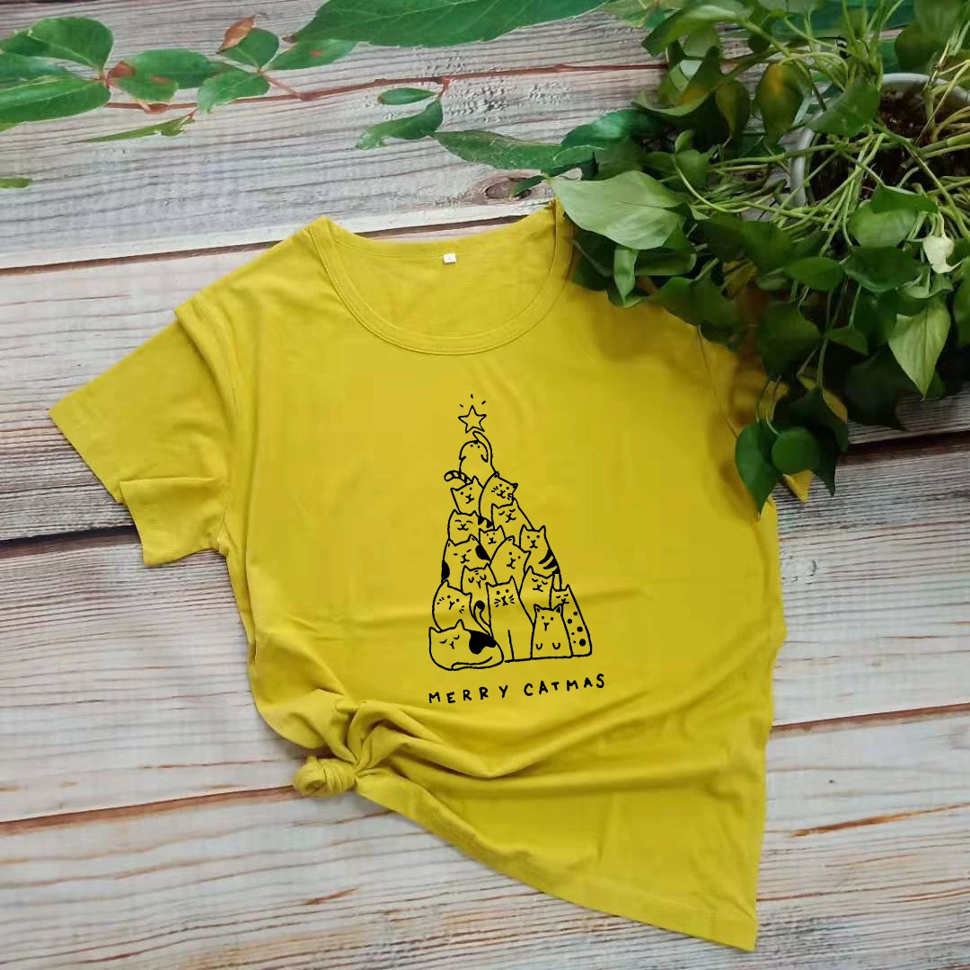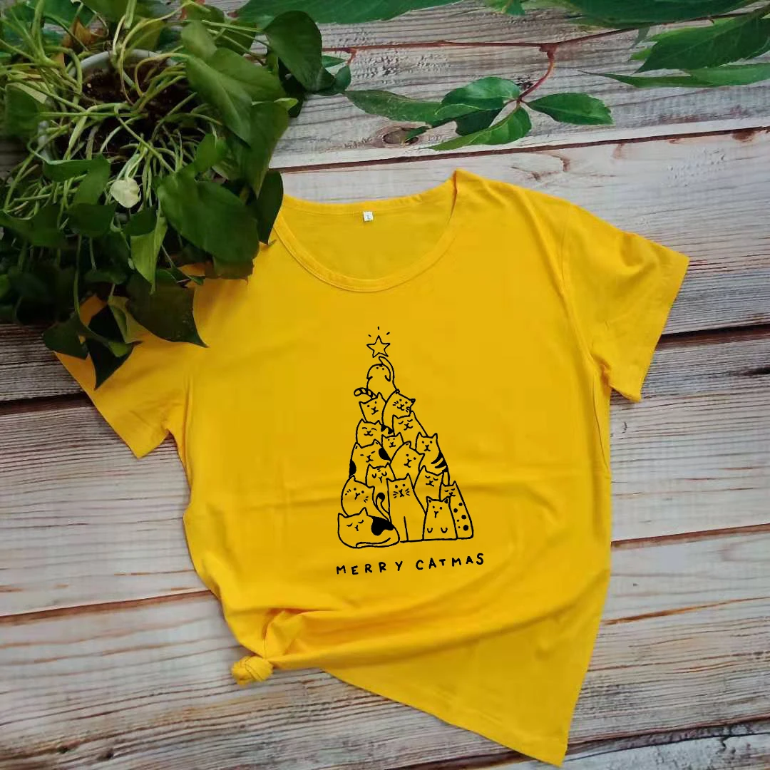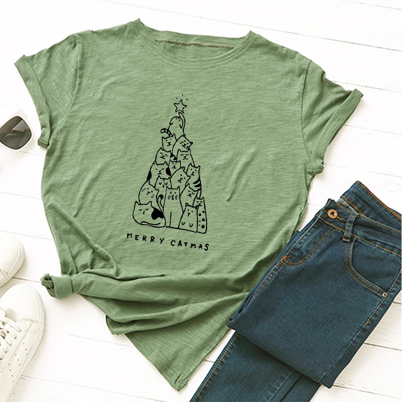 Веселая Рождественская рубашка с изображением кошачьей елки, Женская одежда из 100% хлопка, Harajuku, модная графическая женская футболка с круглым вырезом и коротким рукавом, футболки