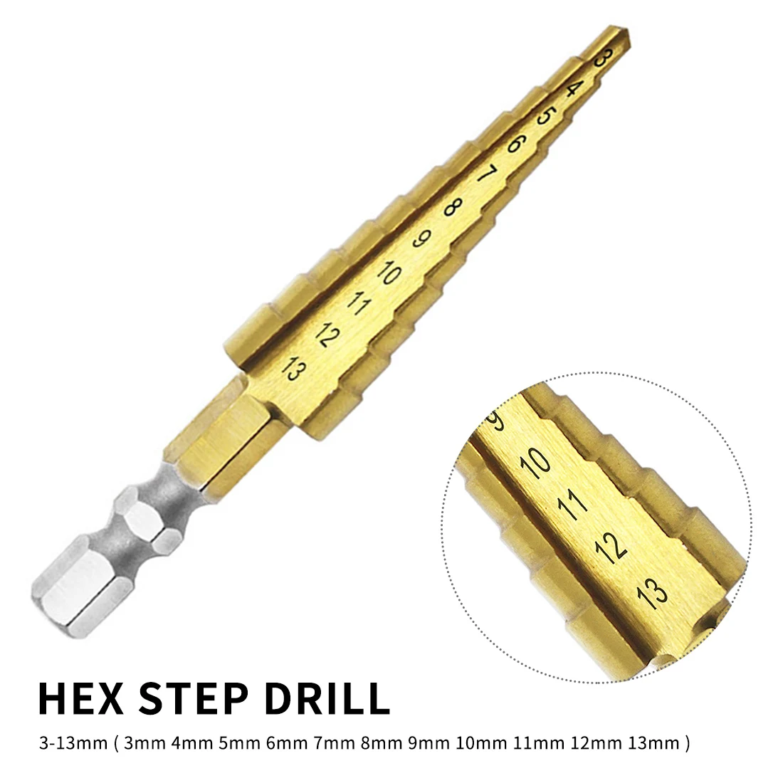 На возраст от 3 до 13 лет mm HSS шаг Core конус сверла бит шестнадцатеричный хвостовик проверочное Буровое Сверло для металла, дерева с HSS Титан покрытием шаг сверла по металлу