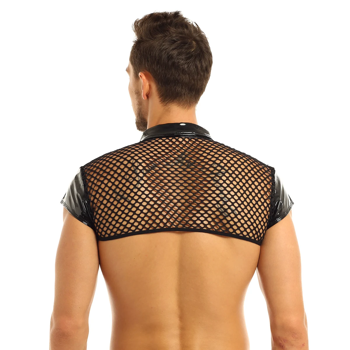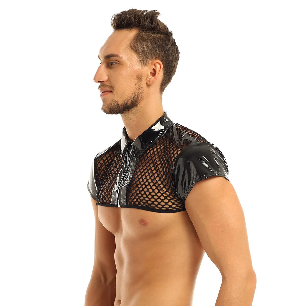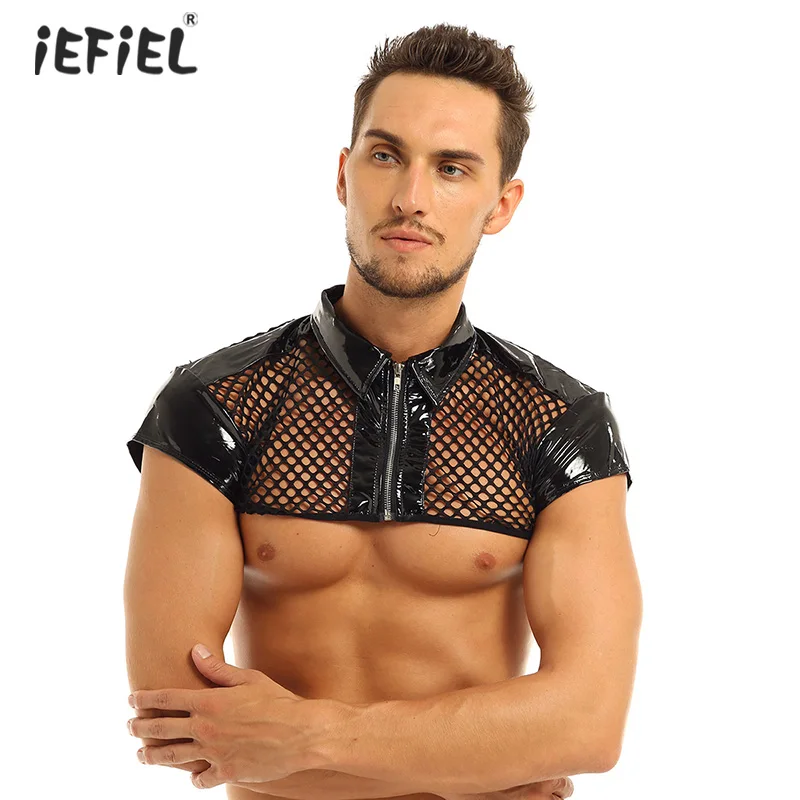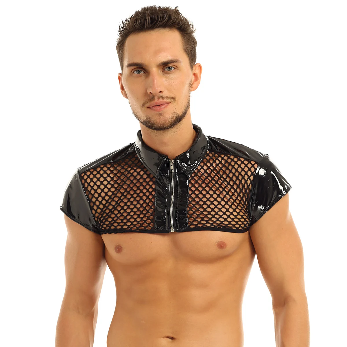 Мужская мода плеча Грудь Жгут рубашки топы, лакированная кожа сращивания.