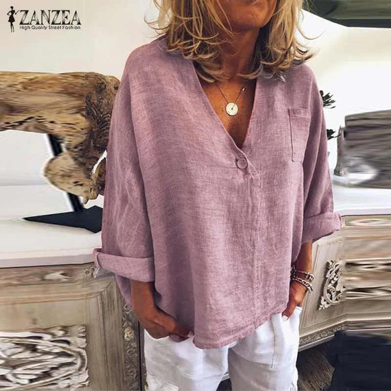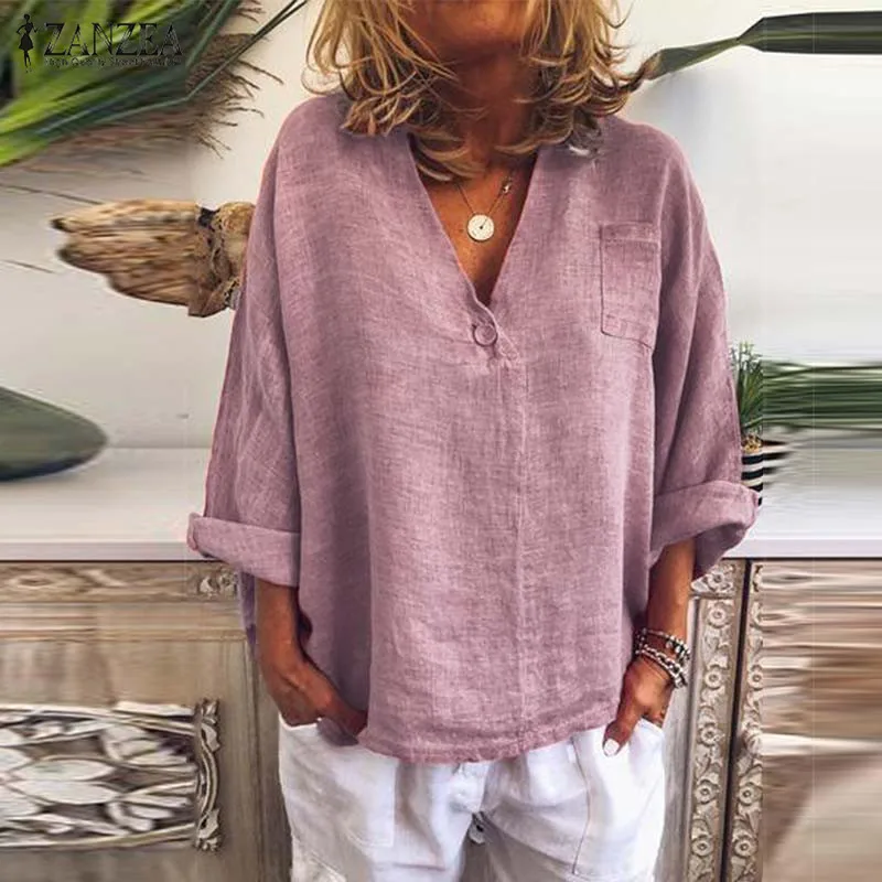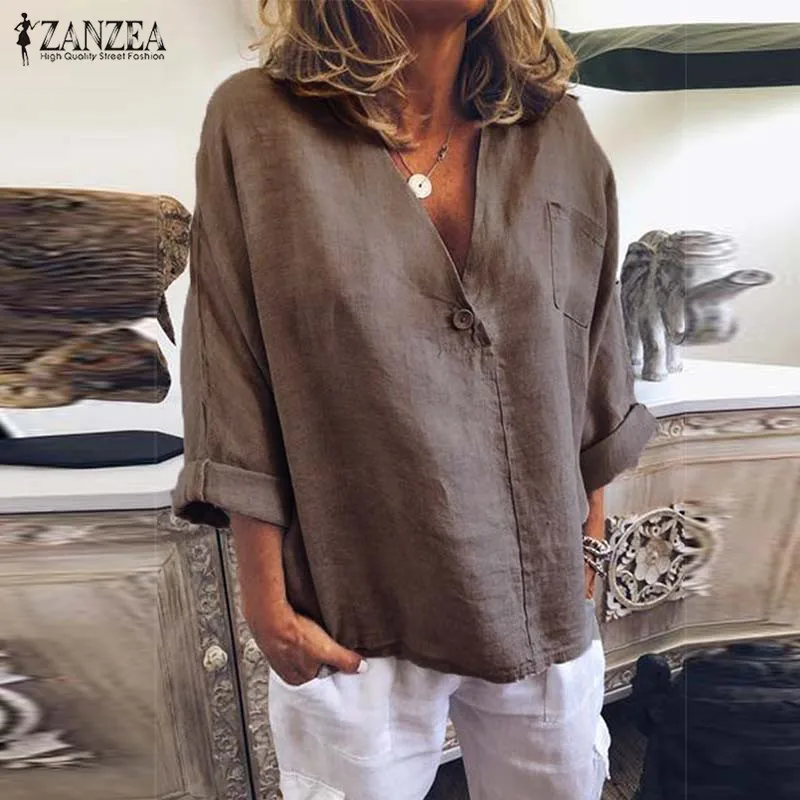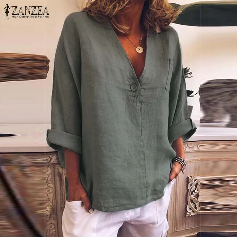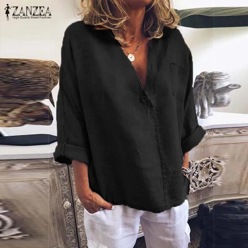 ZANZEA женская блузка с длинным рукавом с v-образным вырезом, Повседневная Однотонная рубашка, осенние свободные блузки, Женская туника, топы для офиса, сорочка размера плюс