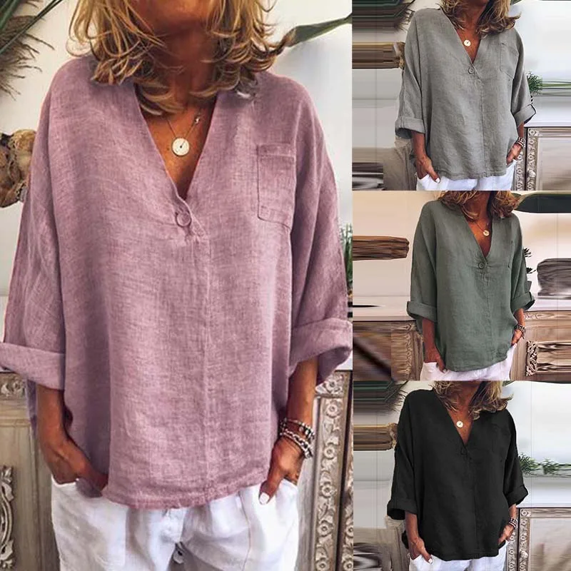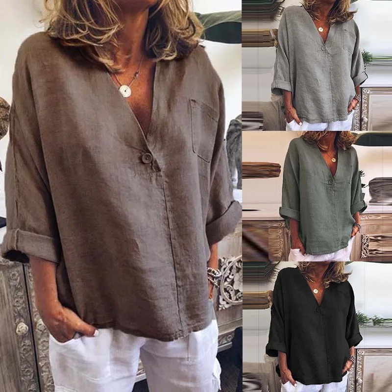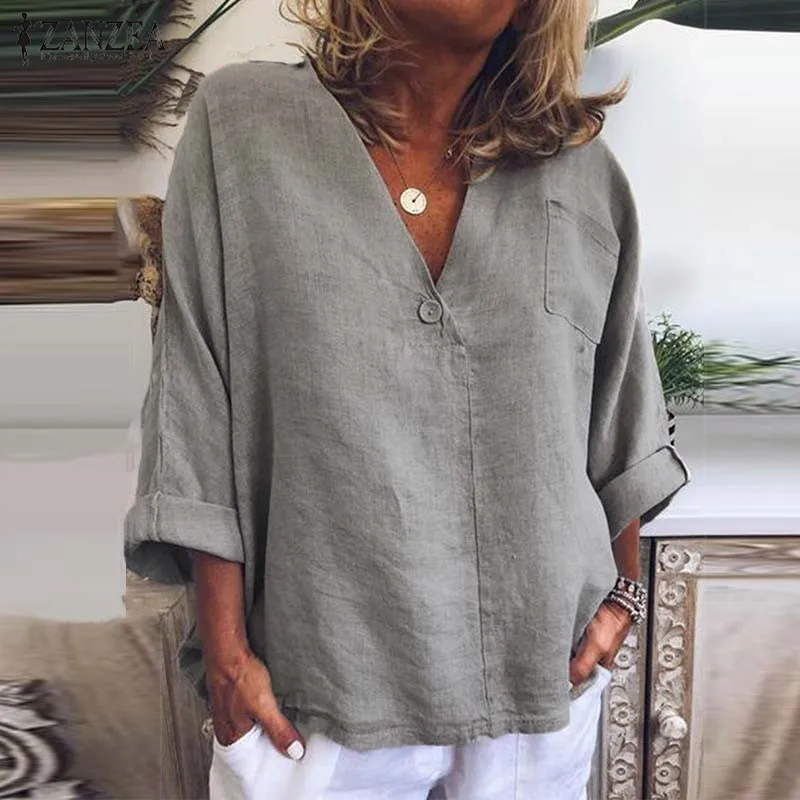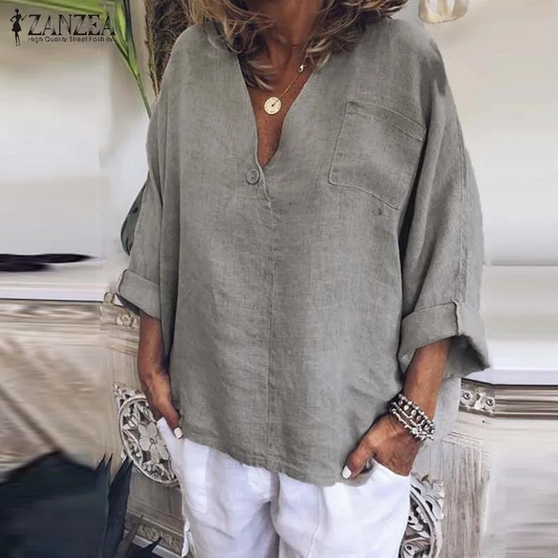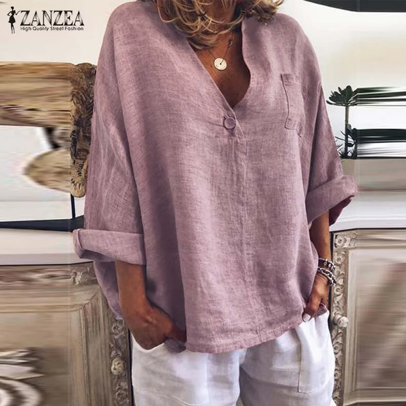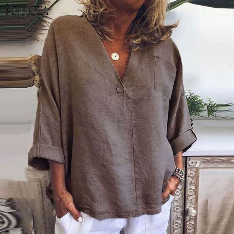ZANZEA женская блузка с длинным рукавом с v-образным вырезом, Повседневная Однотонная рубашка, осенние свободные блузки, Женская туника, топы для офиса, сорочка размера плюс