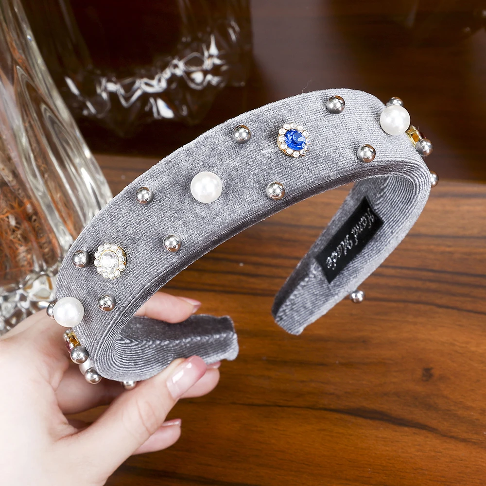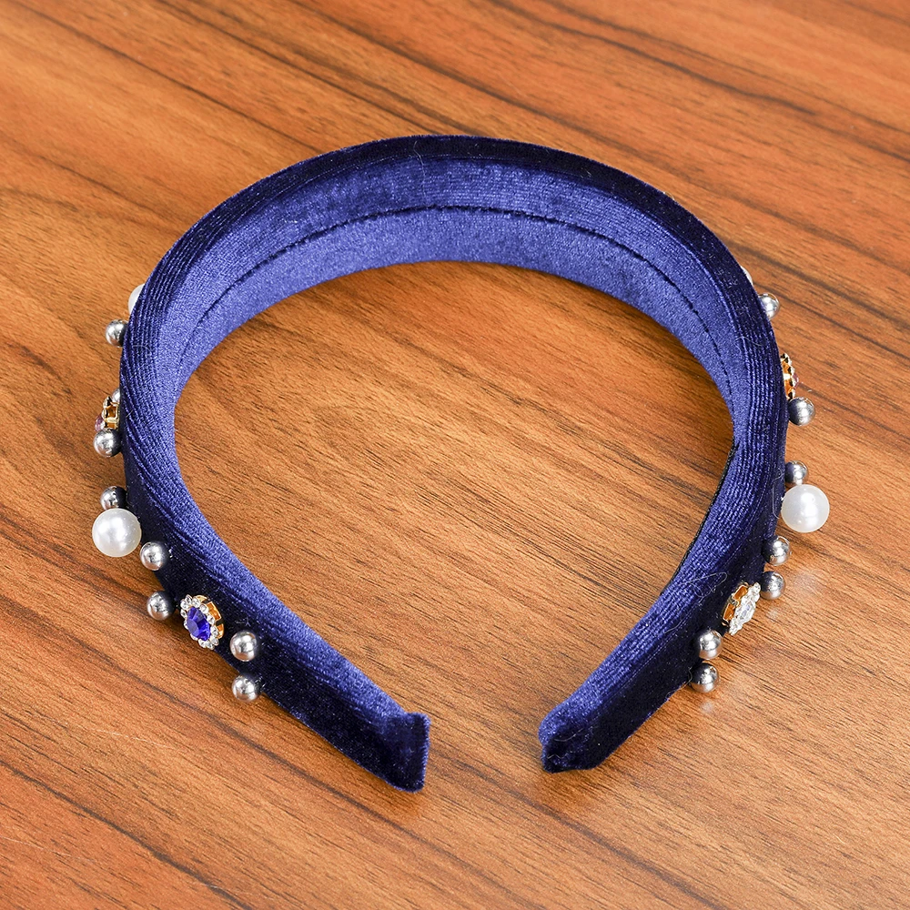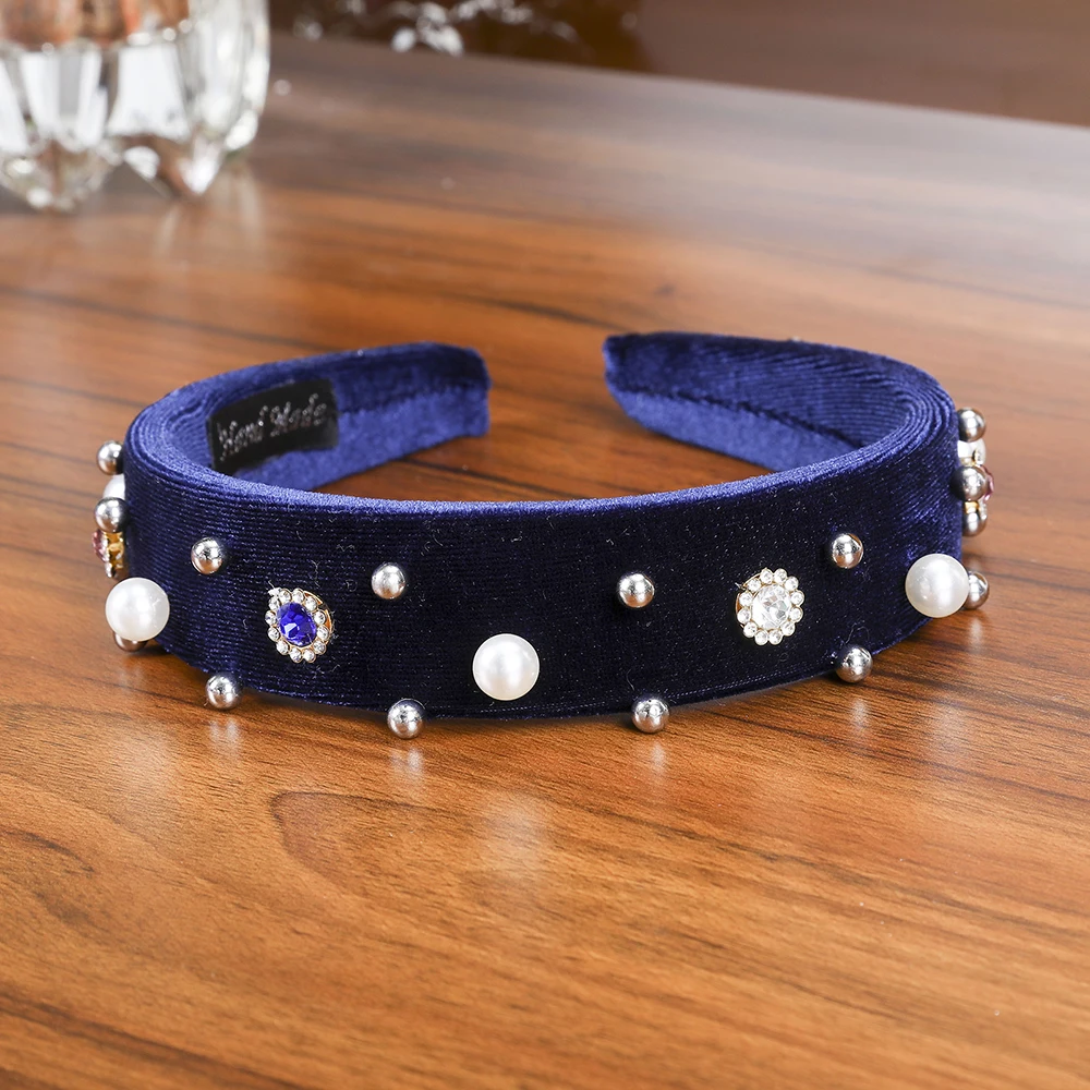 Обруч для волос Женский бархатный с жемчугом и синим кристаллом