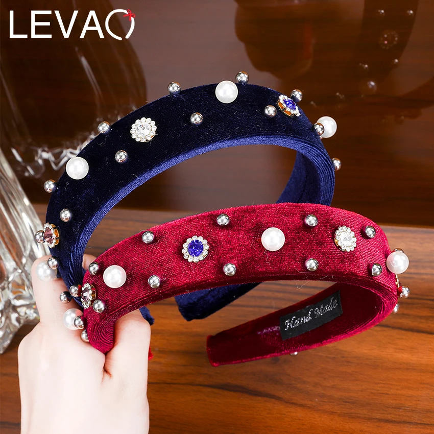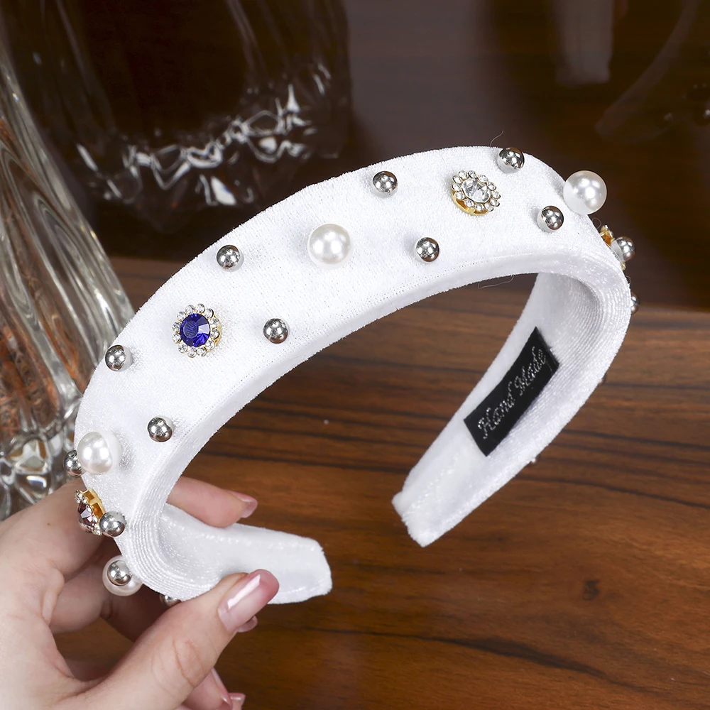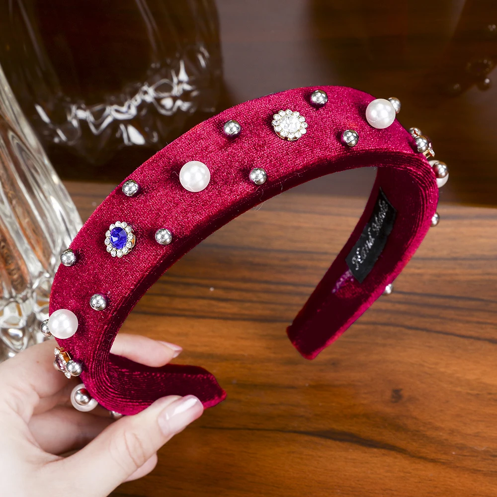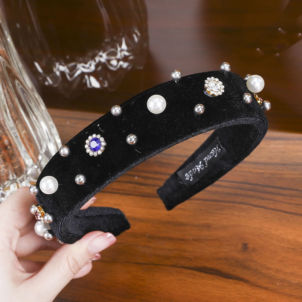 Обруч для волос Женский бархатный с жемчугом и синим кристаллом