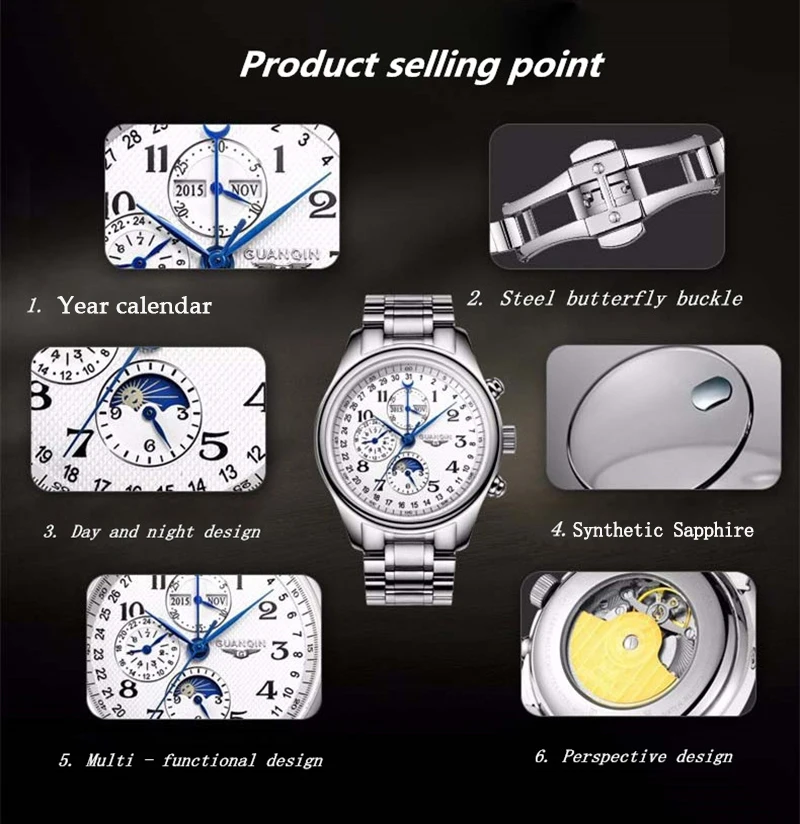 Добро пожаловать в Официальный магазин Tourbillon Watch 0.Меня зовут Ван Си Инь, генеральный менеджер гуанцина. Для меня большая честь представить вам эти высококачественные часы-модель № GUANQIN 20022. Он встроен с высококачественным многофункциональным автоматическим механизмом, улучшенным зеркалом из сапфирового стекла (обновление зеркала из сапфирового стекла со 2 марта 2020 г.), с отображением года, месяца, недели, даты, И фазу Луны, которую вы можете настроить по своему усмотрению. Изображения часов отображаются здесь для вашей справки, если вы хотите узнать больше об этой модели, вы можете проверить клип, надеюсь, что поможет вам сделать правильный выбор.Хорошего дня.