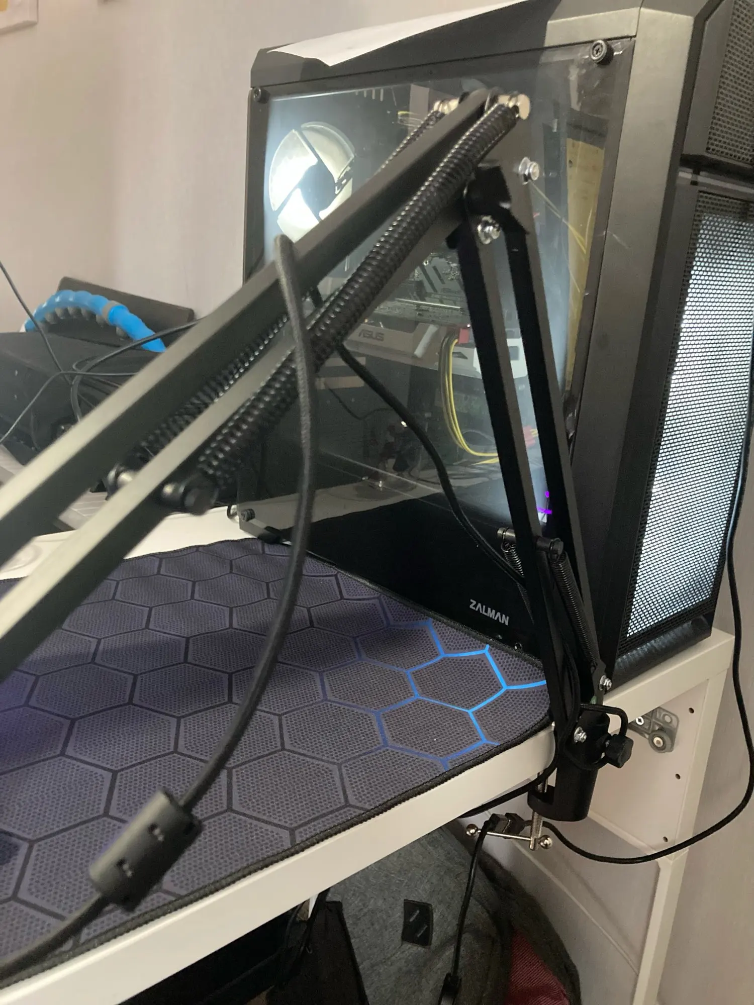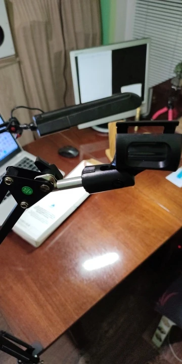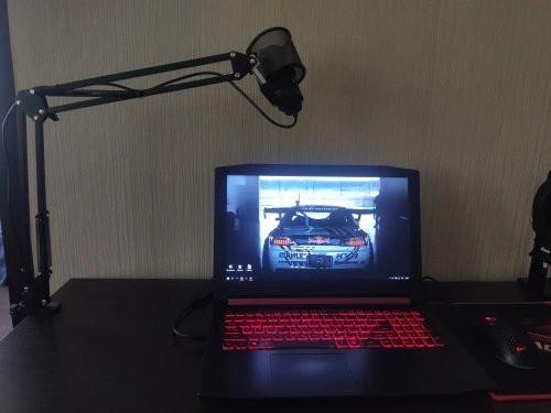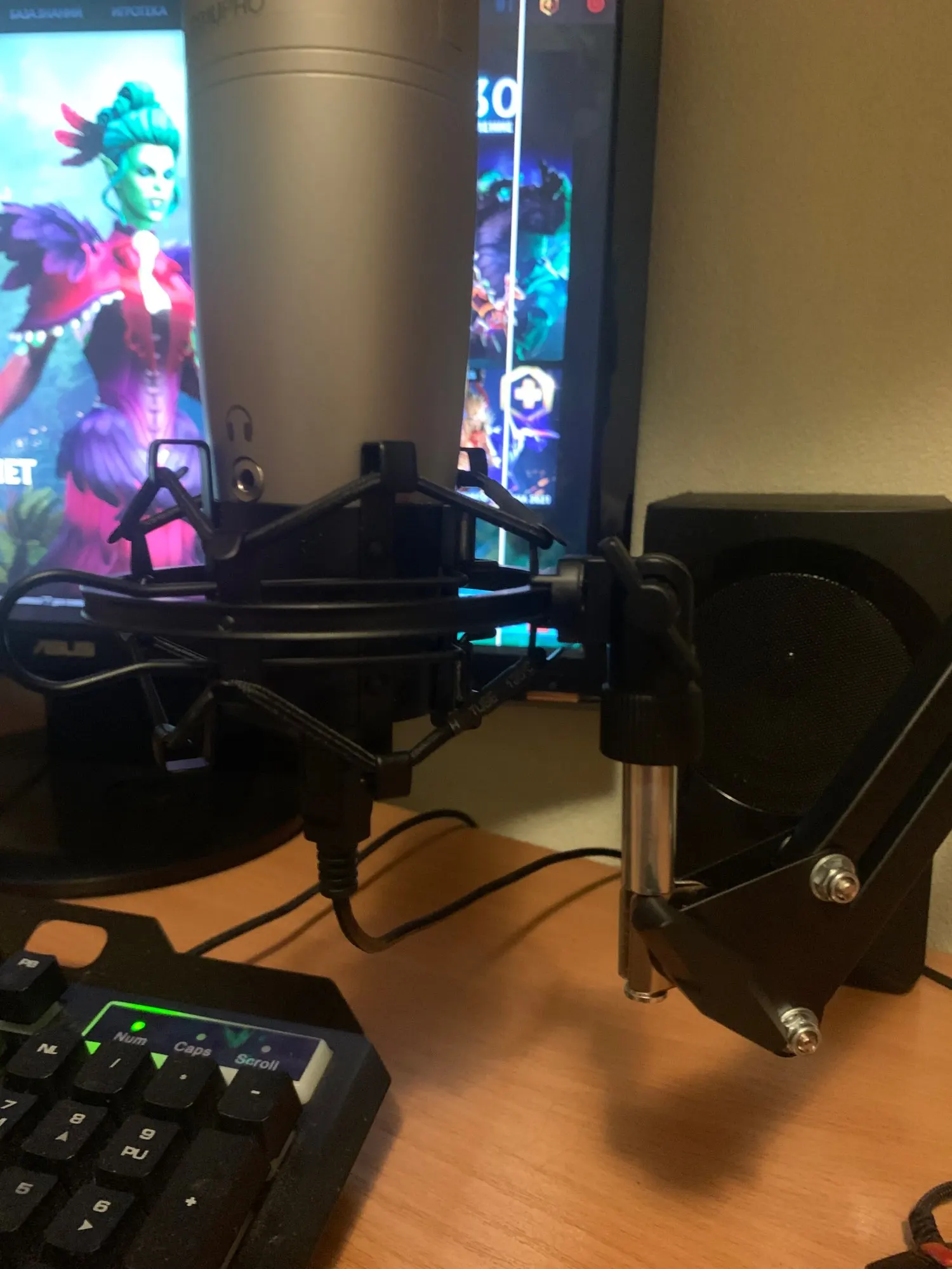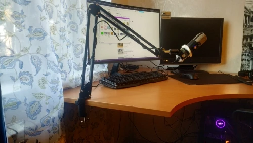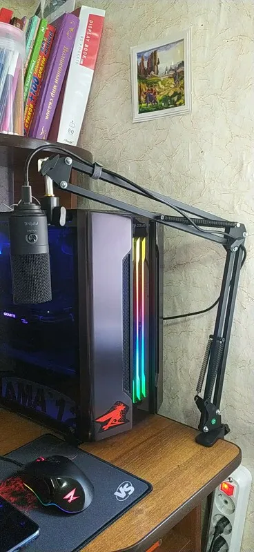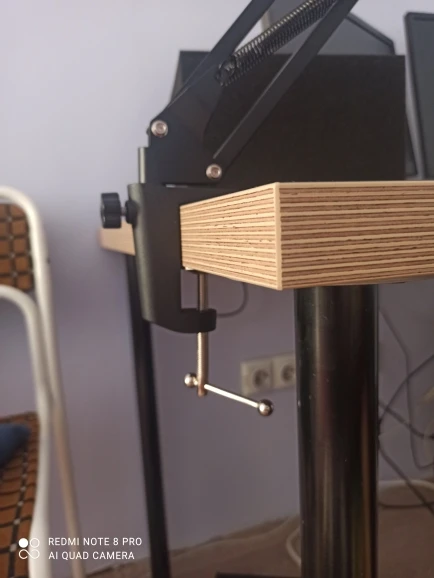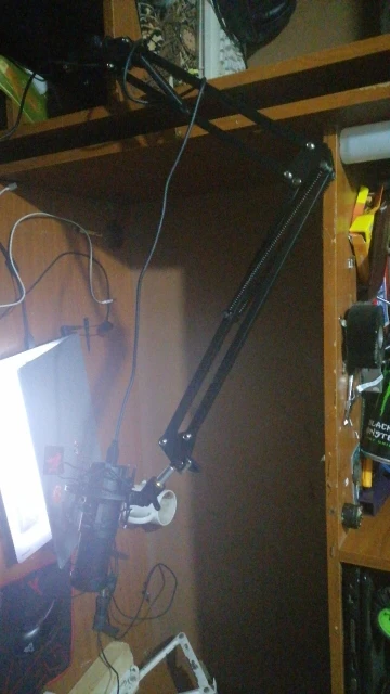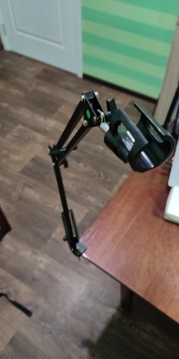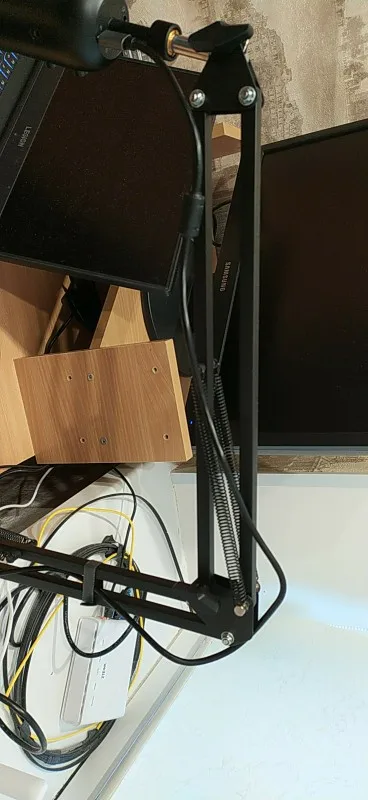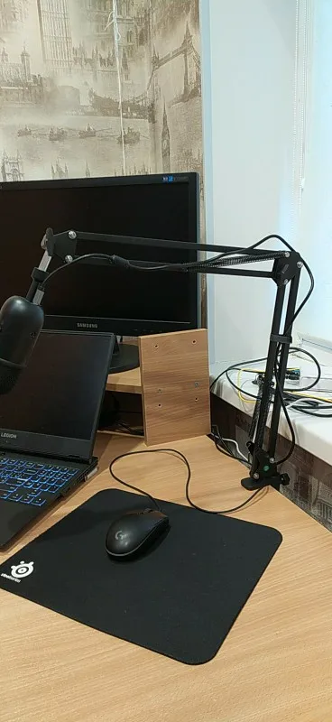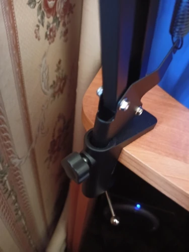 ■ Хороший пантограф. ■Микрофон hyperX quadcast ►Весом 254 г держит хорошо, не падает. Видно на фото. ■Держатель который крепится к столу массивный и не сгибается. ■Раздражительный крепёж который держит сам микрофон, который постоянно если двигать микрофон чуть влево откручивается, из за этого приходиться делать целый круг микрофоном вправо что бы она прикрутилась. Это не сильно критично если она открутилась и микрофон стоит на одном месте он не будет болтаться и т.д пока не решите его убрать.