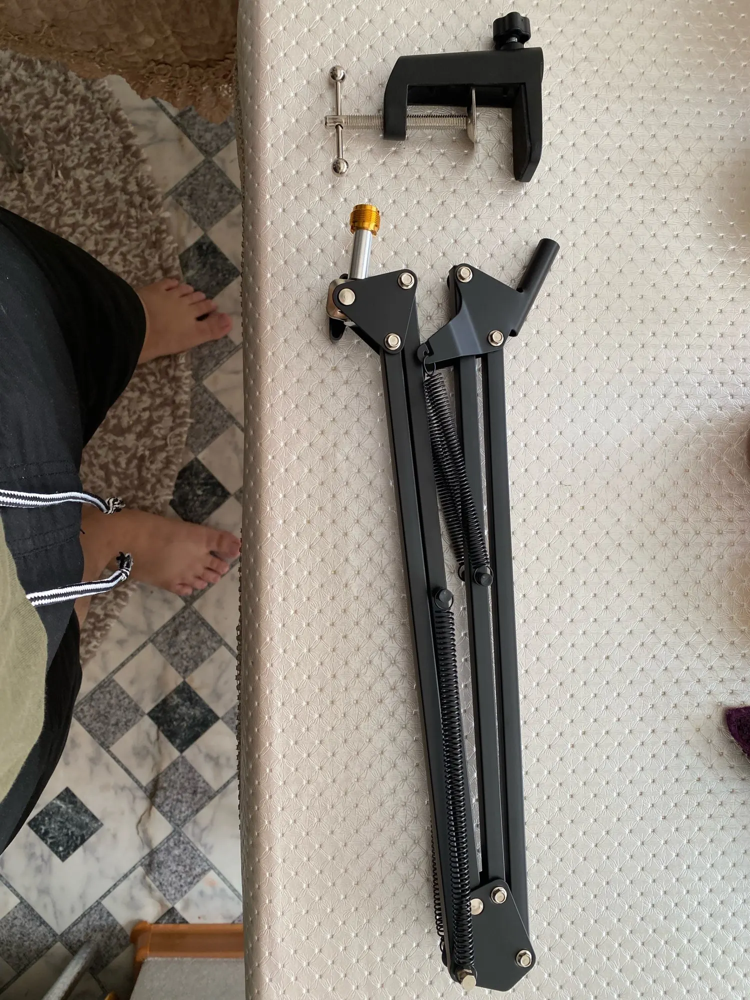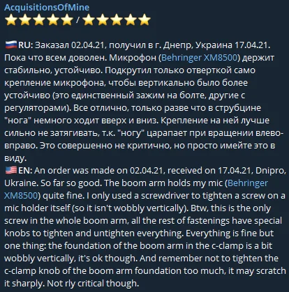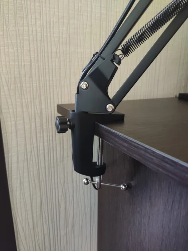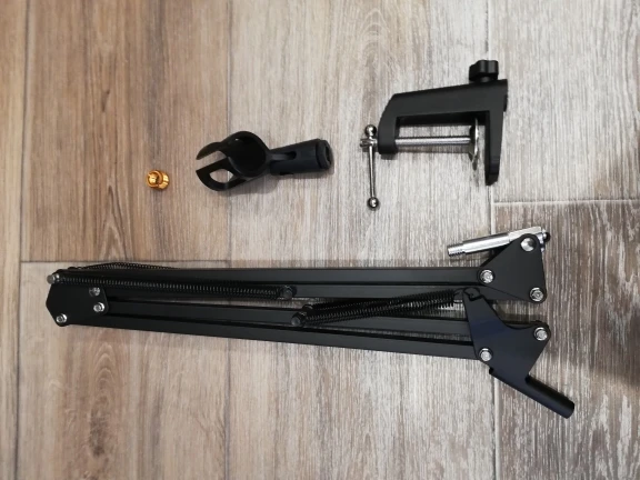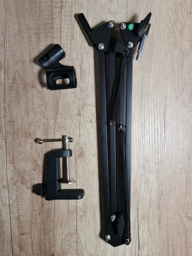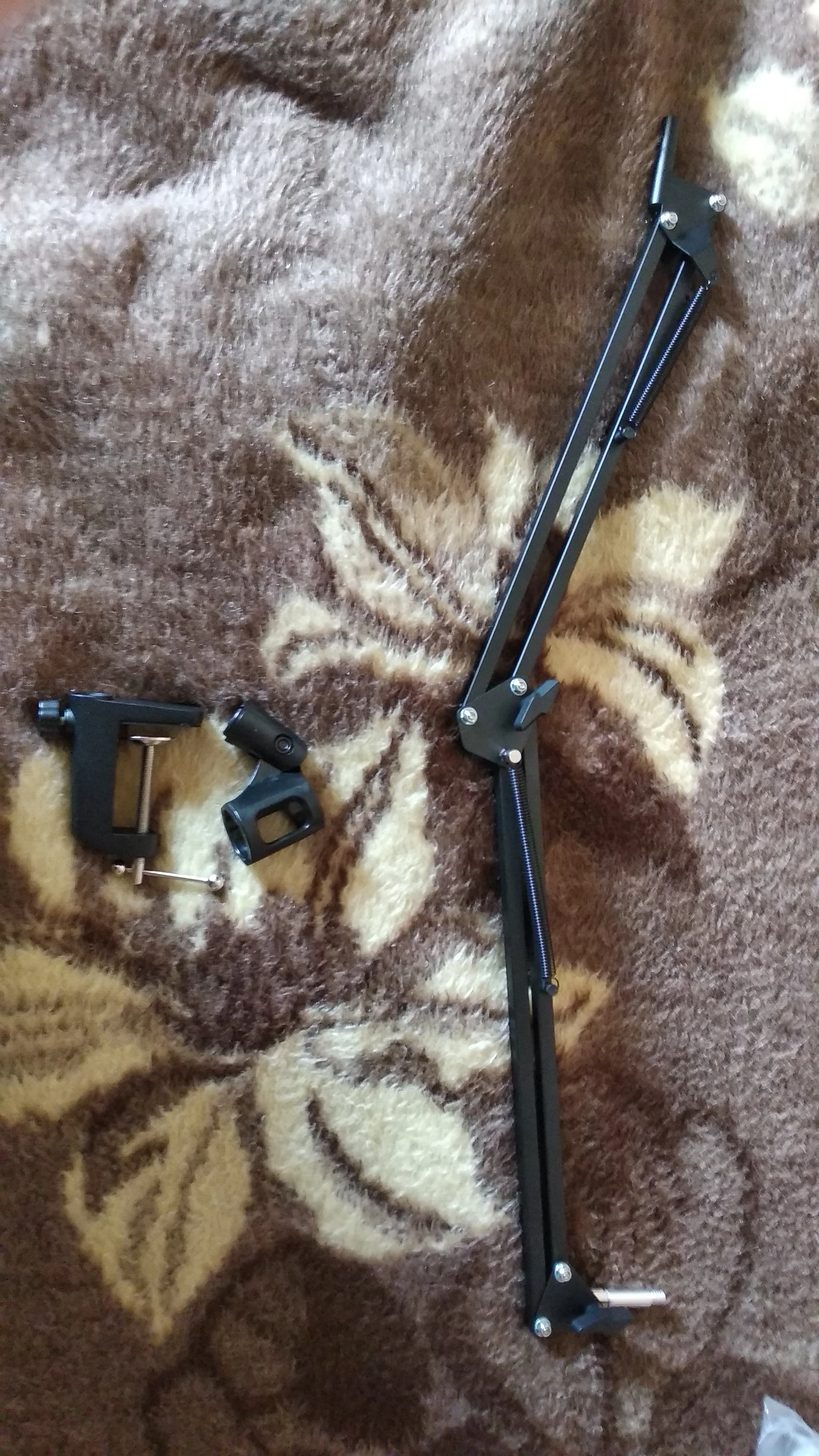 Заказал 02.04.21, получил в г. Днепр, Украина 17.04.21. Микрофон Behringer XM8500 держит устойчиво. Подкрутил только отверткой само крепление микрофона, чтобы вертикально было более устойчиво (это единственный зажим на болте, другие с регуляторами). Все отлично, только разве что в струбцине "нога" немного ходит вверх и вниз. Крепление на ней лучше сильно не затягивать, т.к. "ногу" царапает при вращении влево-вправо. Не критично, просто имейте в виду. Детали в Телеграм: AcquisitionsOfMine An order was made on 02.04.21, received on 17.04.21, Dnipro, Ukraine. It my Behringer XM8500 quite fine. I only used a screwdriver to tighten a screw on a mic holder itself (so it isn't wobbly vertically). Btw, this is the only screw in the whole boom arm, all the rest of fastenings have special knobs to tighten and untighten everything. Everything is fine but one thing: the foundation of the boom arm in the clamp is a bit wobbly vertically, it's ok though. Details are on Telegram: AcquisitionsOfMine