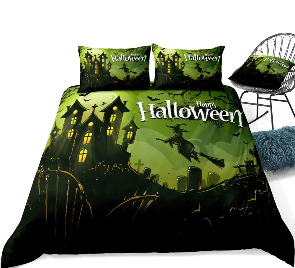3D набор пододеяльников для Хэллоуина, ведьма, летящая на метле, Комплект постельного белья, король, челнока, летучая мышь, домашний текстиль, замок, 3 шт., зеленый пододеяльник для детей
