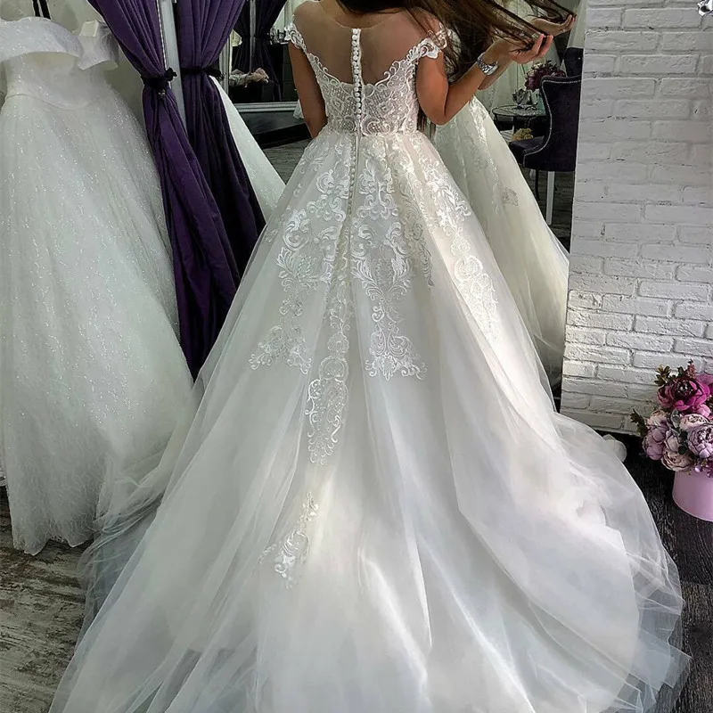 Элегантные кружевные свадебные платья Тюль с аппликацией без рукавов v-образным вырезом Роскошные трапециевидные Кружева Принцесса Свадебные платья для невесты