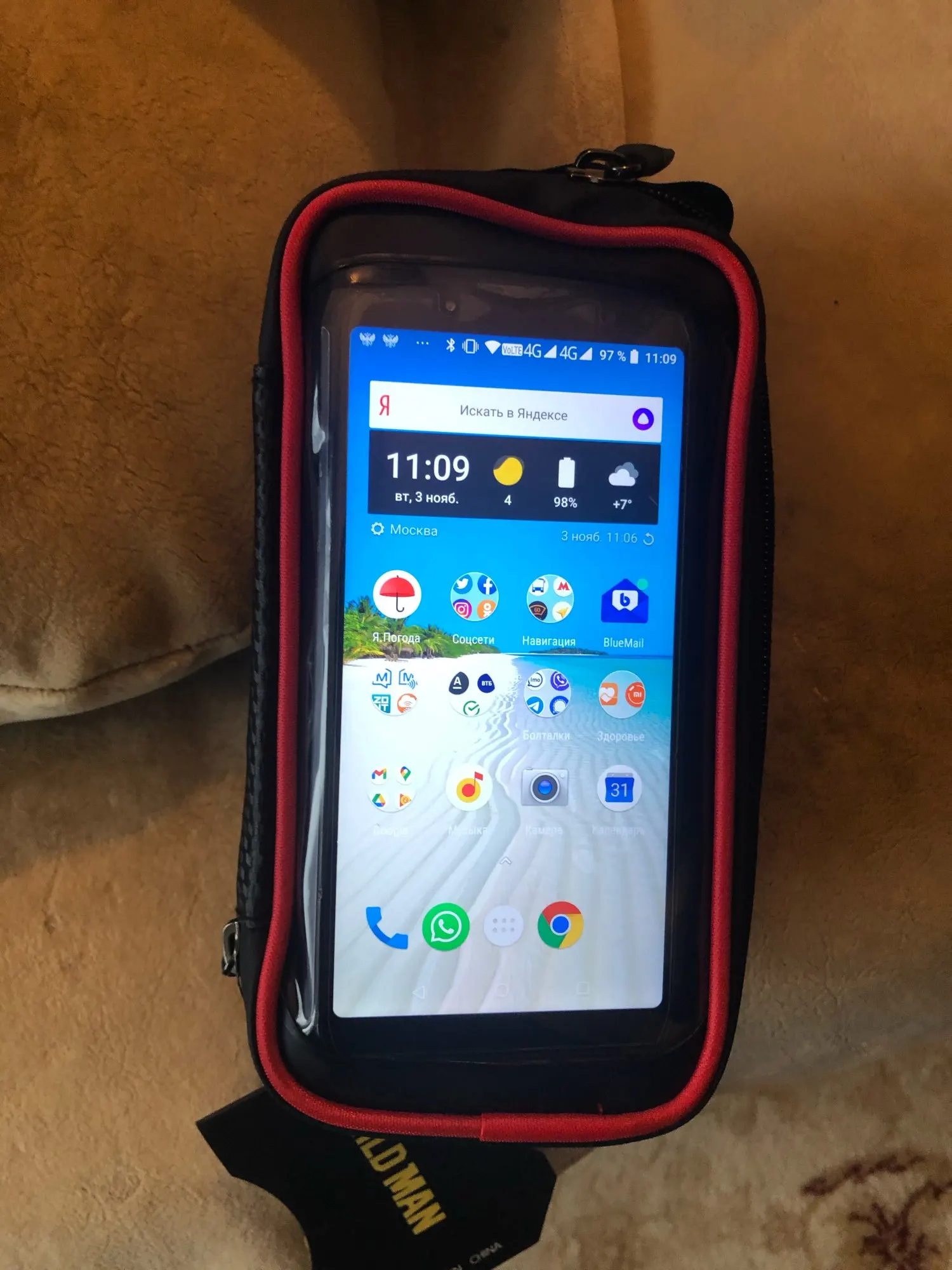 Долетела за 10 дней до Карелии, соответствует описанию. Была немного помята ткань, исправил банкой внутрь. Телефон в ней отлично реагирует, отпечаток пальца не срабатывает, пробовал в тёплом закрытом помещении. Хорошее крепление, но люфтовать думаю немного будет.