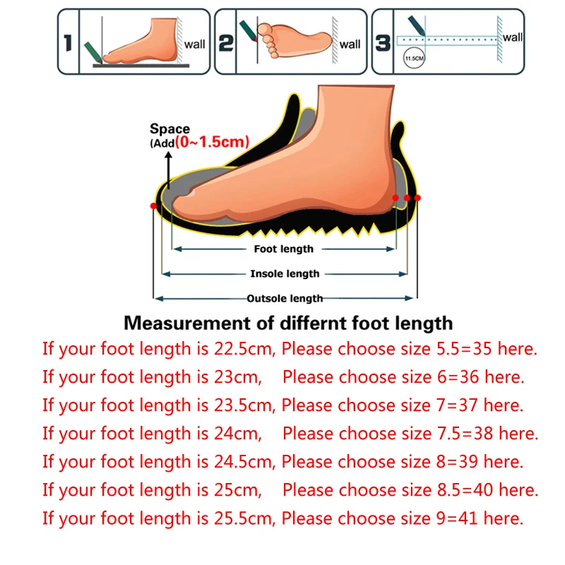 Пожалуйста, выбирайте размер обуви в соответствии с длиной вашей стопы по таблице размеров, приведенной ниже: