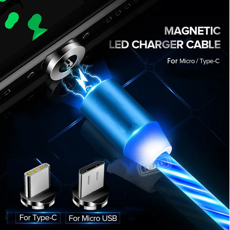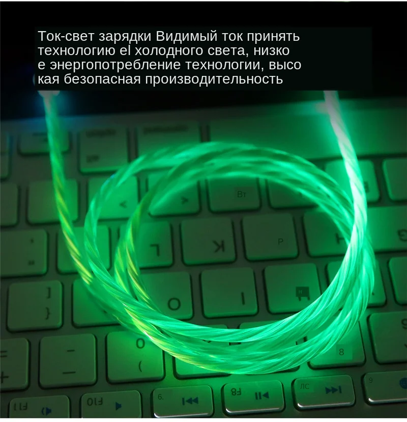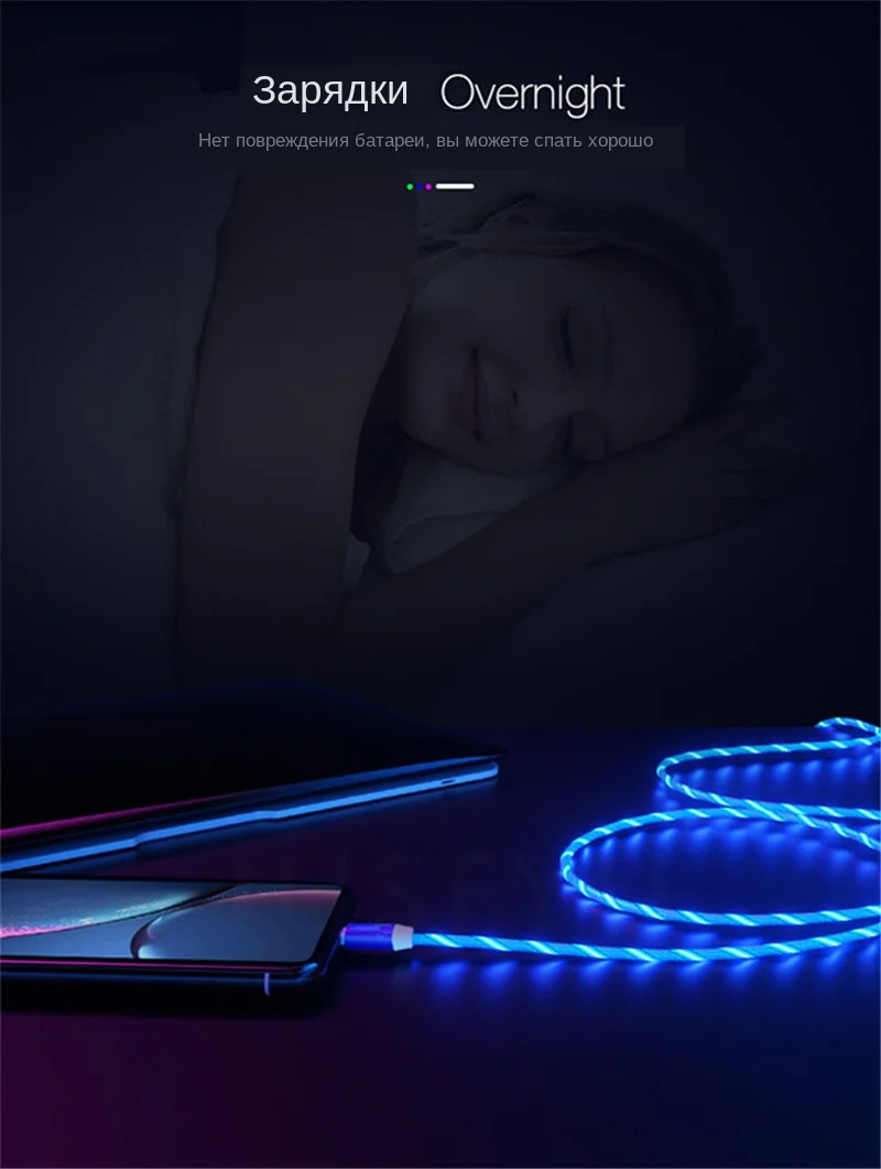 Магнитный зарядный кабель Micro USB Type C LED Flow светящееся осве...
