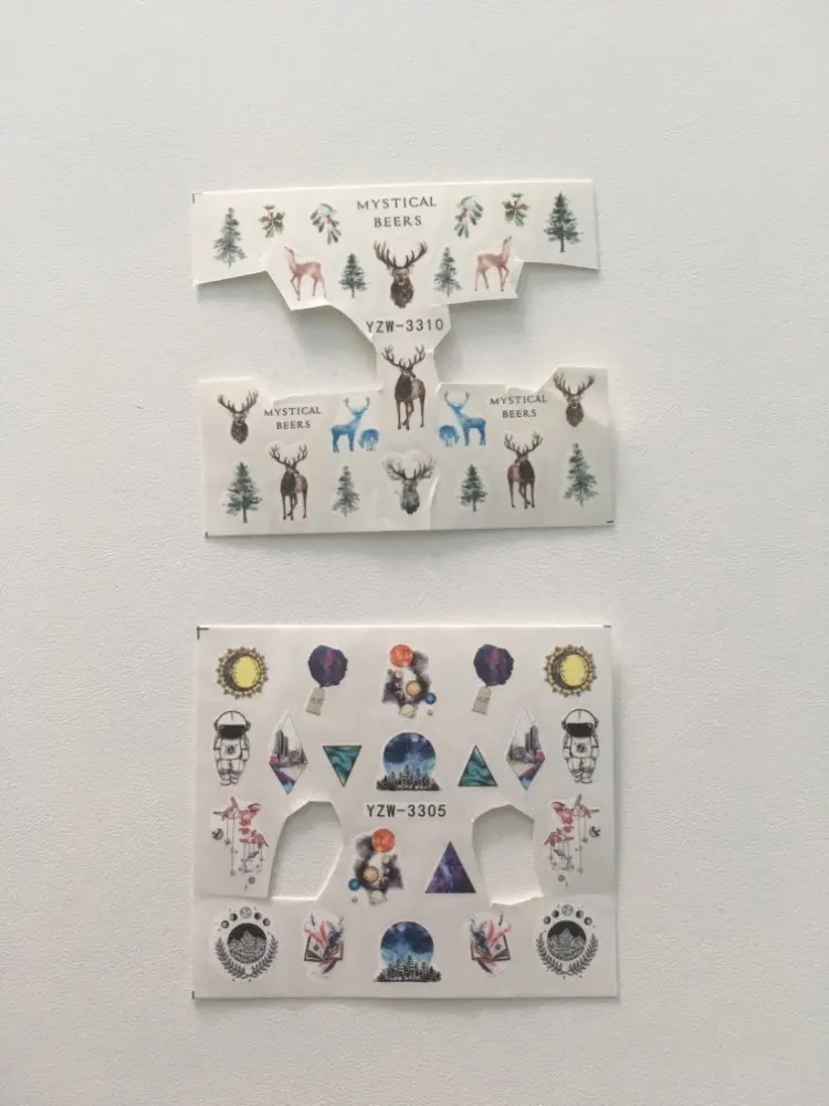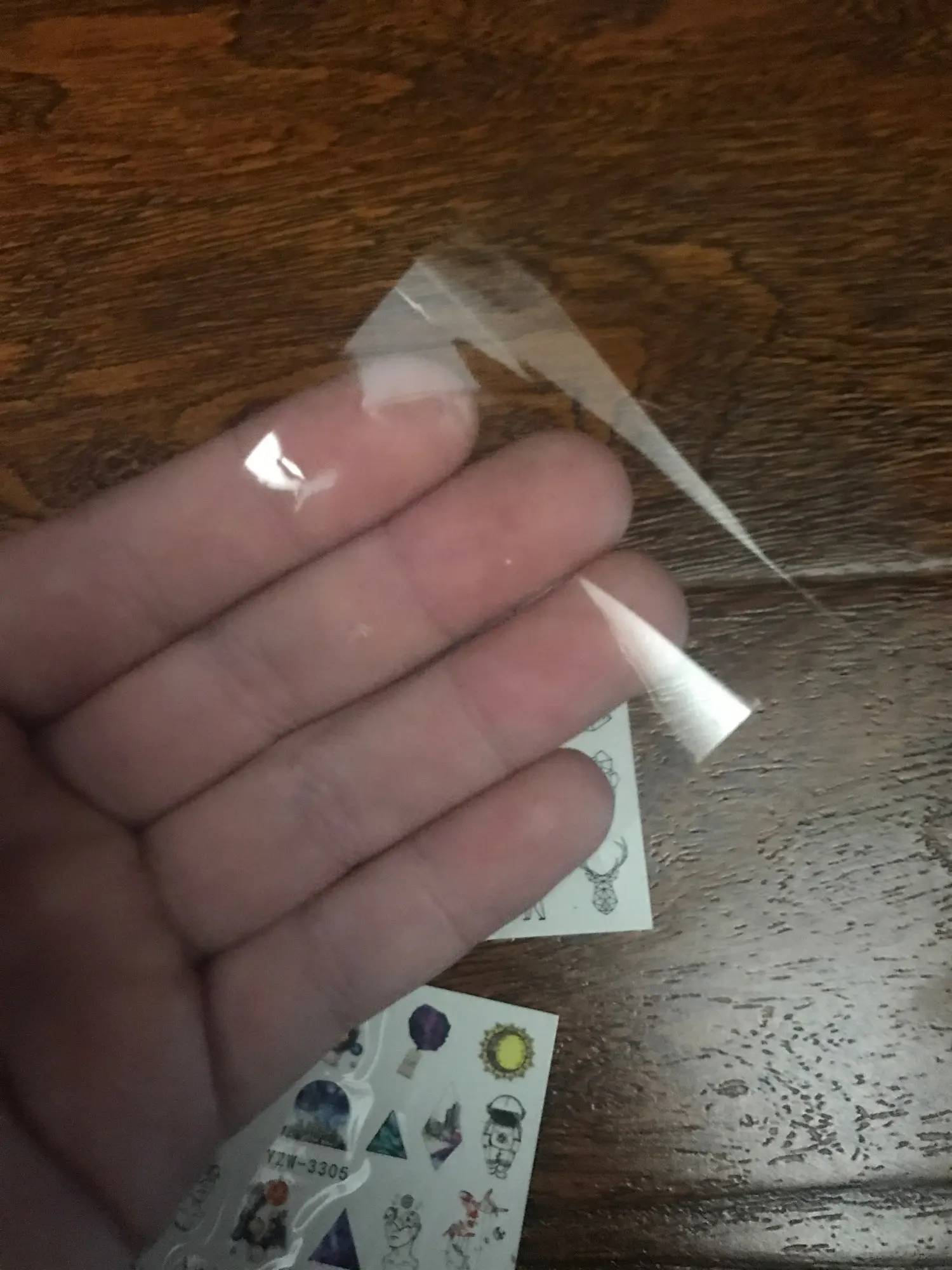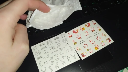 Пришли быстро, меньше месяца. Отслеживалось. Попробовала одну наклейку. На цветных есть пленка, а на чб нету. Просто намочила, моментально прилипла. Описать могу как на ногте как пленка, которая двигается и рисунок не искажается. Если нанести лак то все будет крепко держаться , а я на натуральный ноготь прилепила