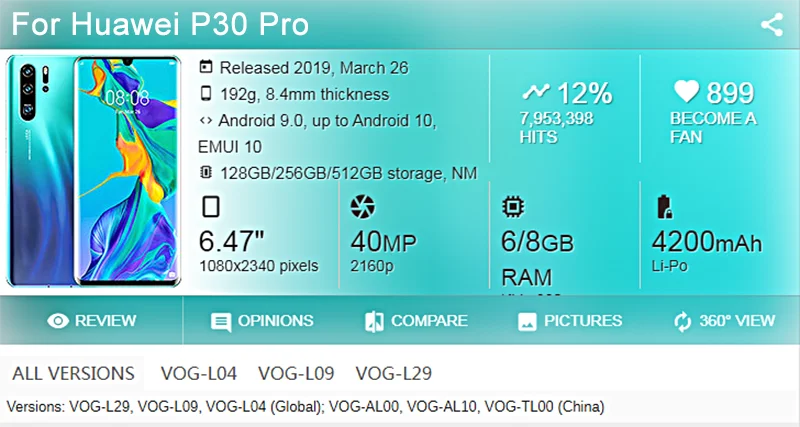 Номер моделиFor Huawei P30 Pro VOG-L04 VOG-L09 VOG-L29