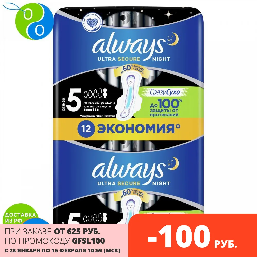 Always Ultra Secure Night (Размер 5) обеспечивают дополнительную защиту в ночное время благодаря увеличенной на 60% площади задней части (по сравнению с гигиеническими прокладками Always Ultra Normal). Вы получаете еще большую защиту от протеканий, сколько бы вы ни двигались в течение ночи. Гигиенические прокладки Always Ultra имеют защитные контуры Secureguard и содержат гель, который впитывает и удерживает влагу, помогая предотвращать протекания. А благодаря технологии нейтрализации запаха эти прокладки запирают неприятный запах, а не маскируют его. Гигиенические прокладки Always Ultra Night толщиной всего 3 мм обеспечивают до 100% защиты в ночное время и дарят ощущение комфорта. Always Ultra Secure Night (Размер 5) — лучшие гигиенические прокладки Always Ultra для защиты в ночное время. Выбирайте надежную защиту специально для вашей формы и интенсивности выделений с Always MyFit.