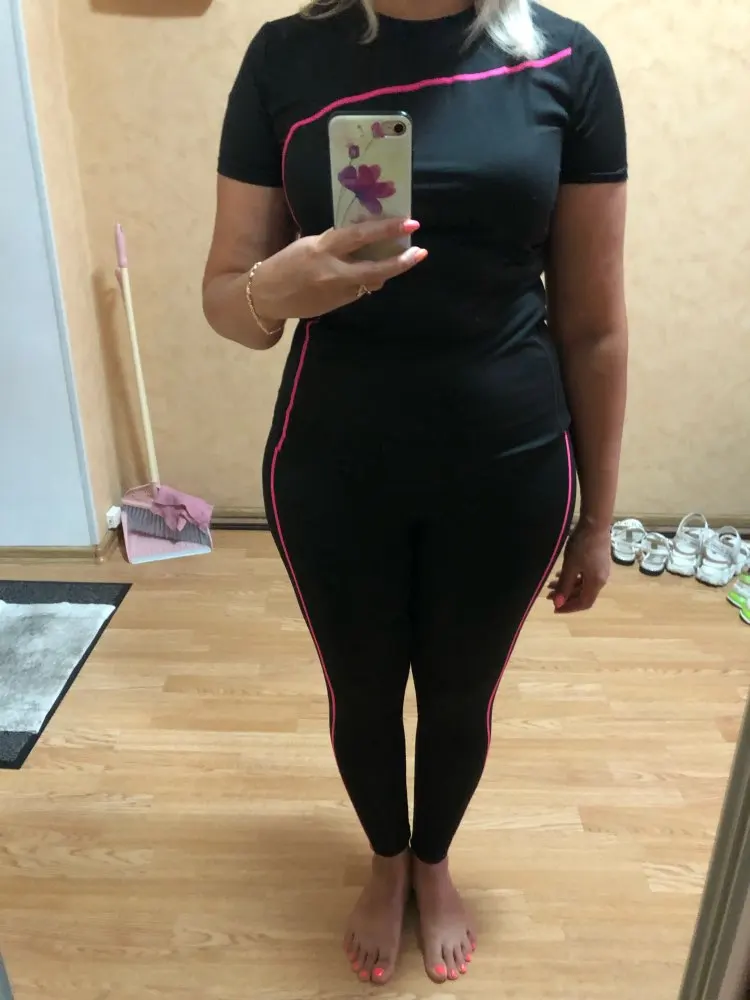 костюмчик не плохой, но мне на мои 94-70-94 ооочень в обтяжку футболка, не комфортно себя чувствую, а штаны наоборот большеватые и на мой рост 152 коротковатые, но это не страшно конечно. для спортзала подходит, только чтоб побегать на дорожке или поработать с гантелями стоя, для всего остального, что связано с наклонами и тем более присядом не пойдет, очень сильно просвечивает.