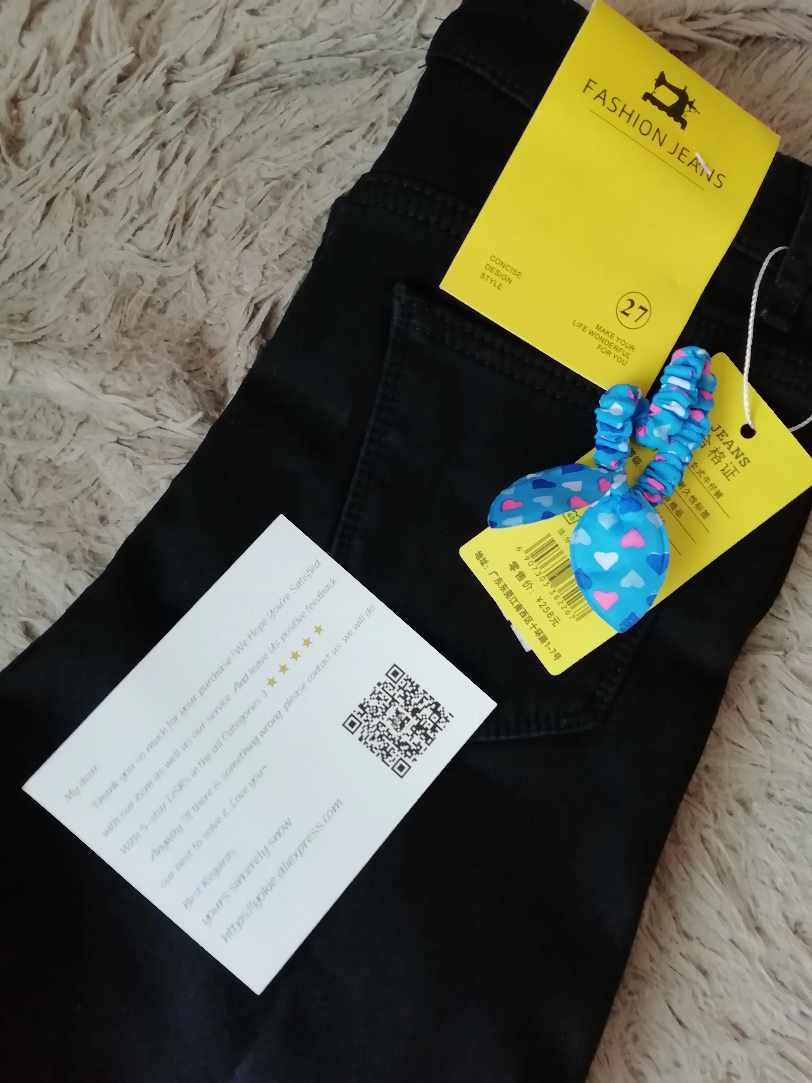Джинсы пришли в Украину быстро. Качество хорошее, несколько ниток торчали, но их можно обрезать, не критично. Размер точный, молния металлическая. Небольшой посторонний запах. Бонусом - резинка для волос ☺