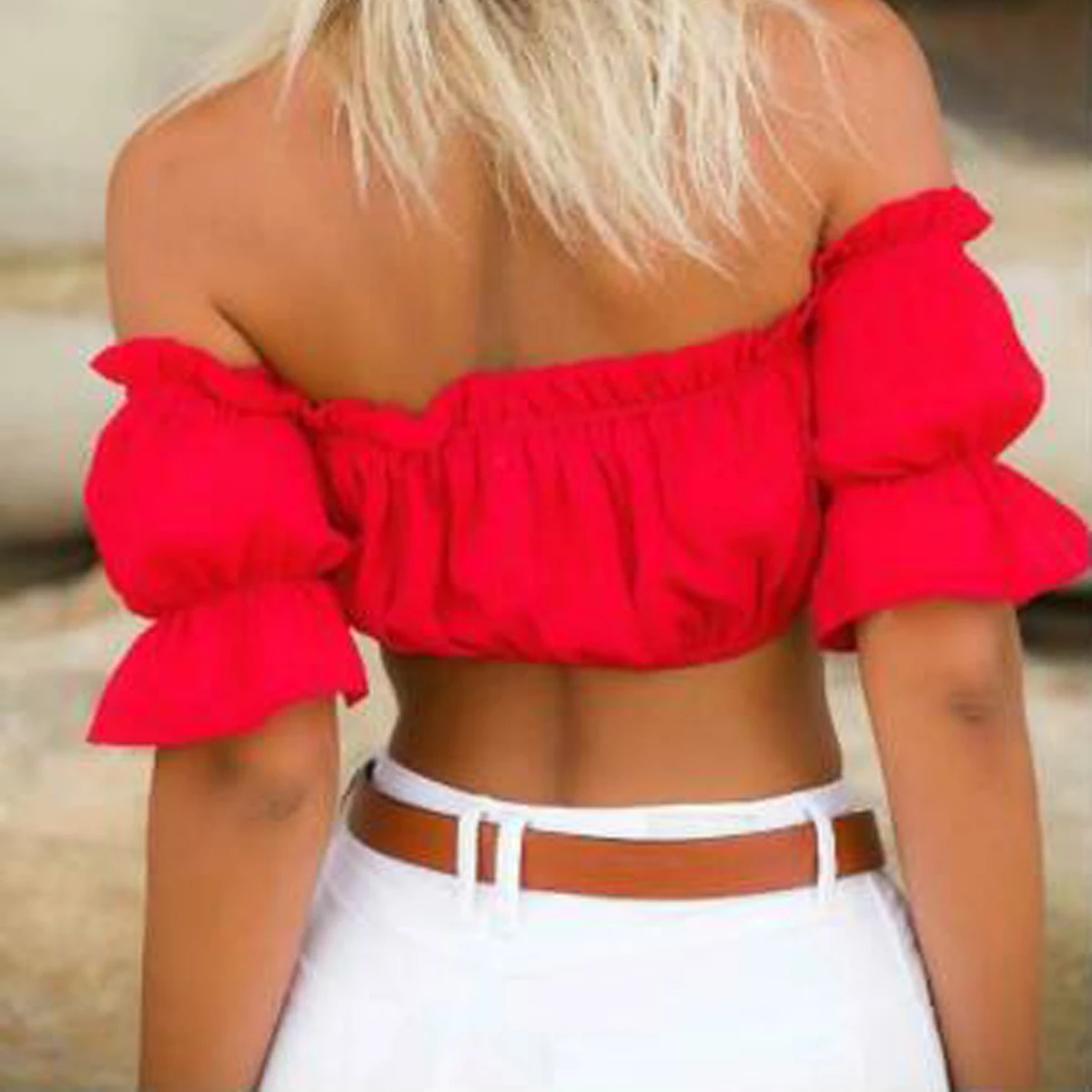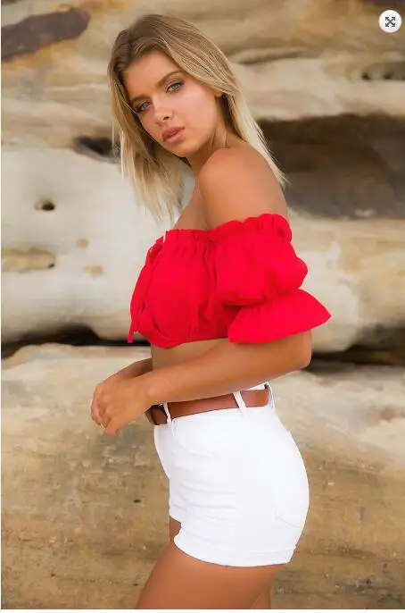 Лидер продаж, пикантный женский эластичный топ с короткими пышными рукавами, укороченные женские топы с открытыми плечами, летняя одежда, топ-бандо с оборками
