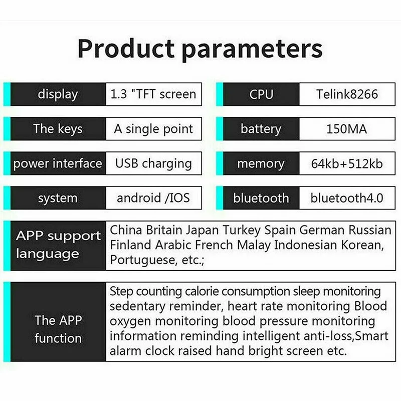 1. Отображение времени, секундомер, счетчик шагов, калории, расстояние, мониторинг сна, поднимите руку, чтобы осветить экран.