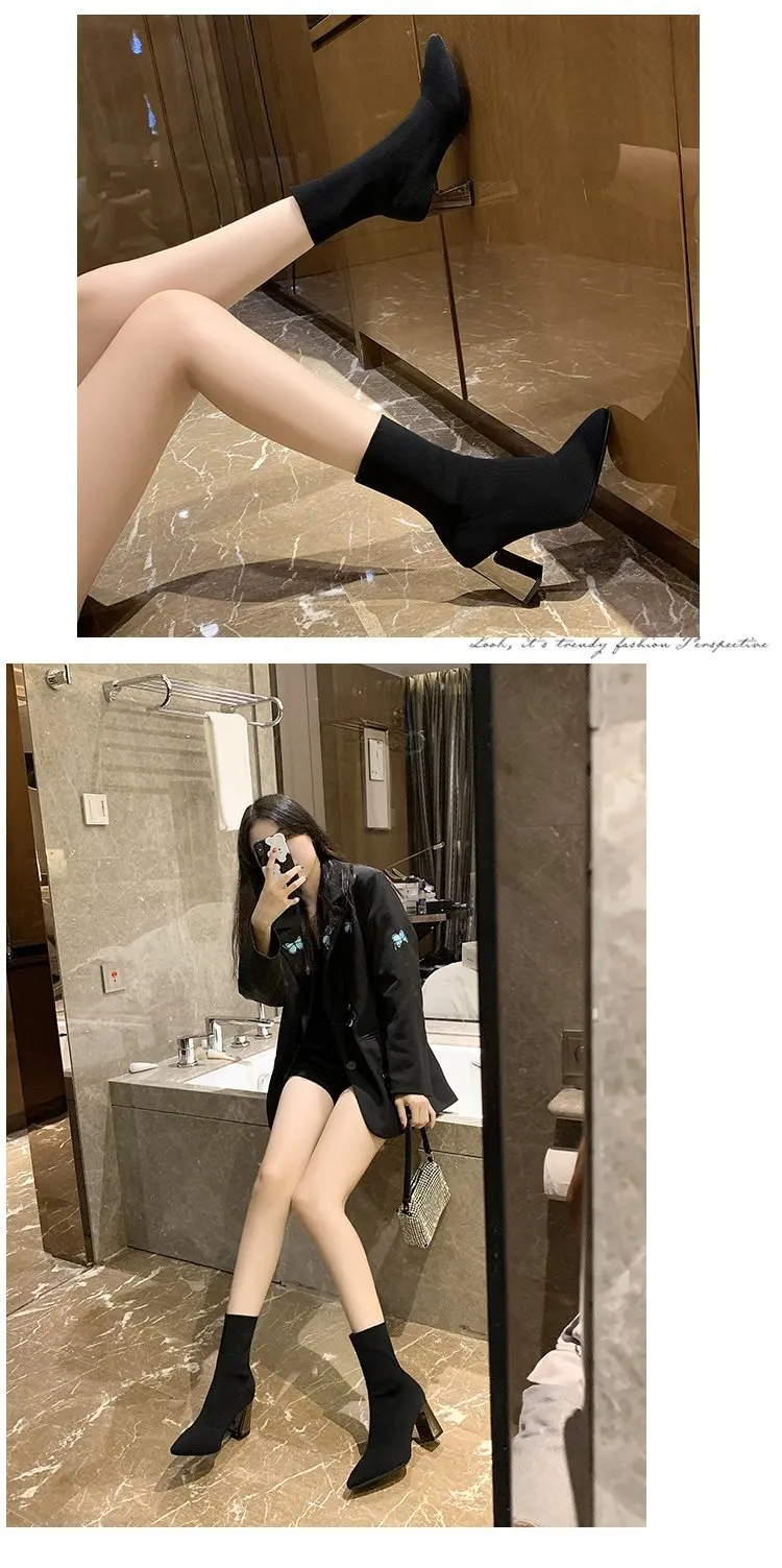 Качественные вязаные эластичные женские ботинки, модная зимняя обувь, женские ботильоны на толстом каблуке с острым носком, теплые ботинки на высоком каблуке, обувь для вечеринки