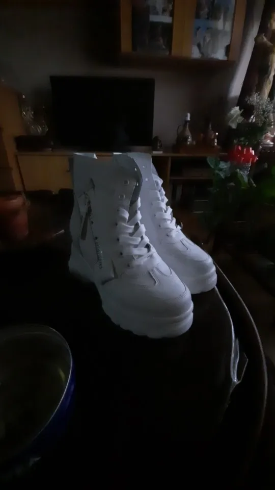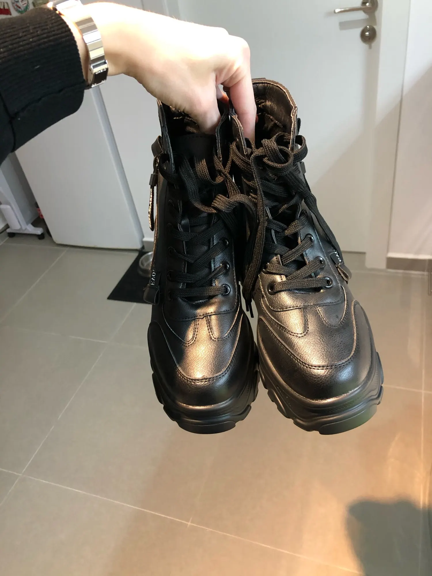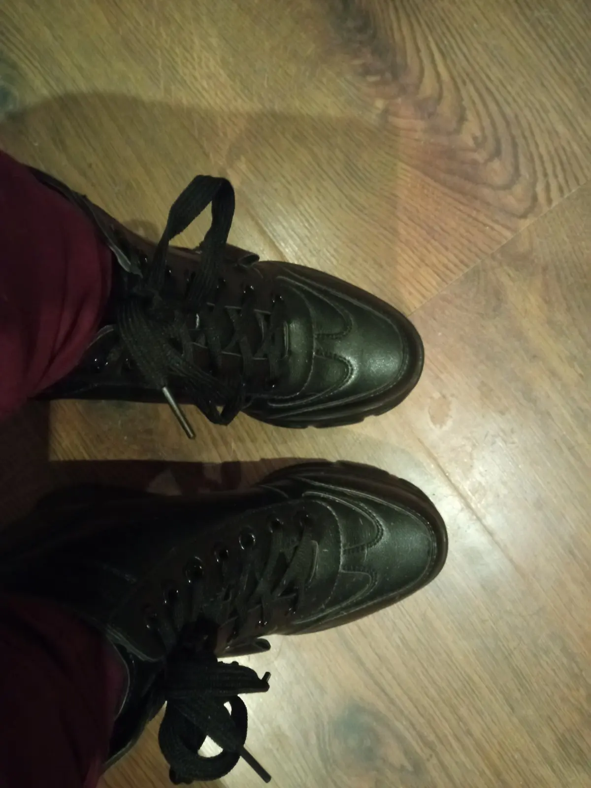 Ботинки понравились, соответствуют картинке. Удобная модель. Жаль, что не нашла такие из натуральной кожи. Размер почти подошёл. Правая нога немного больше, немного туговат правый ботинок. Получила через 18 дней от заказа, спасибо оперативно.