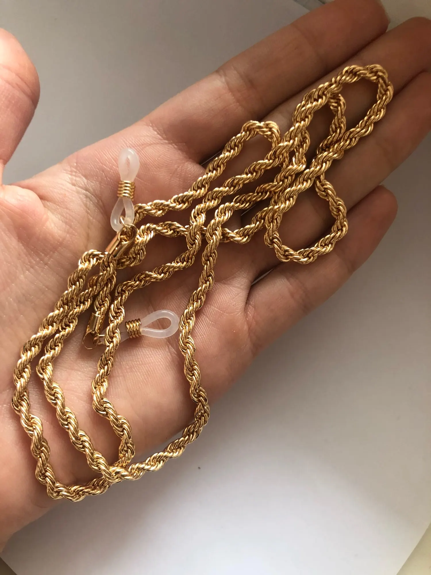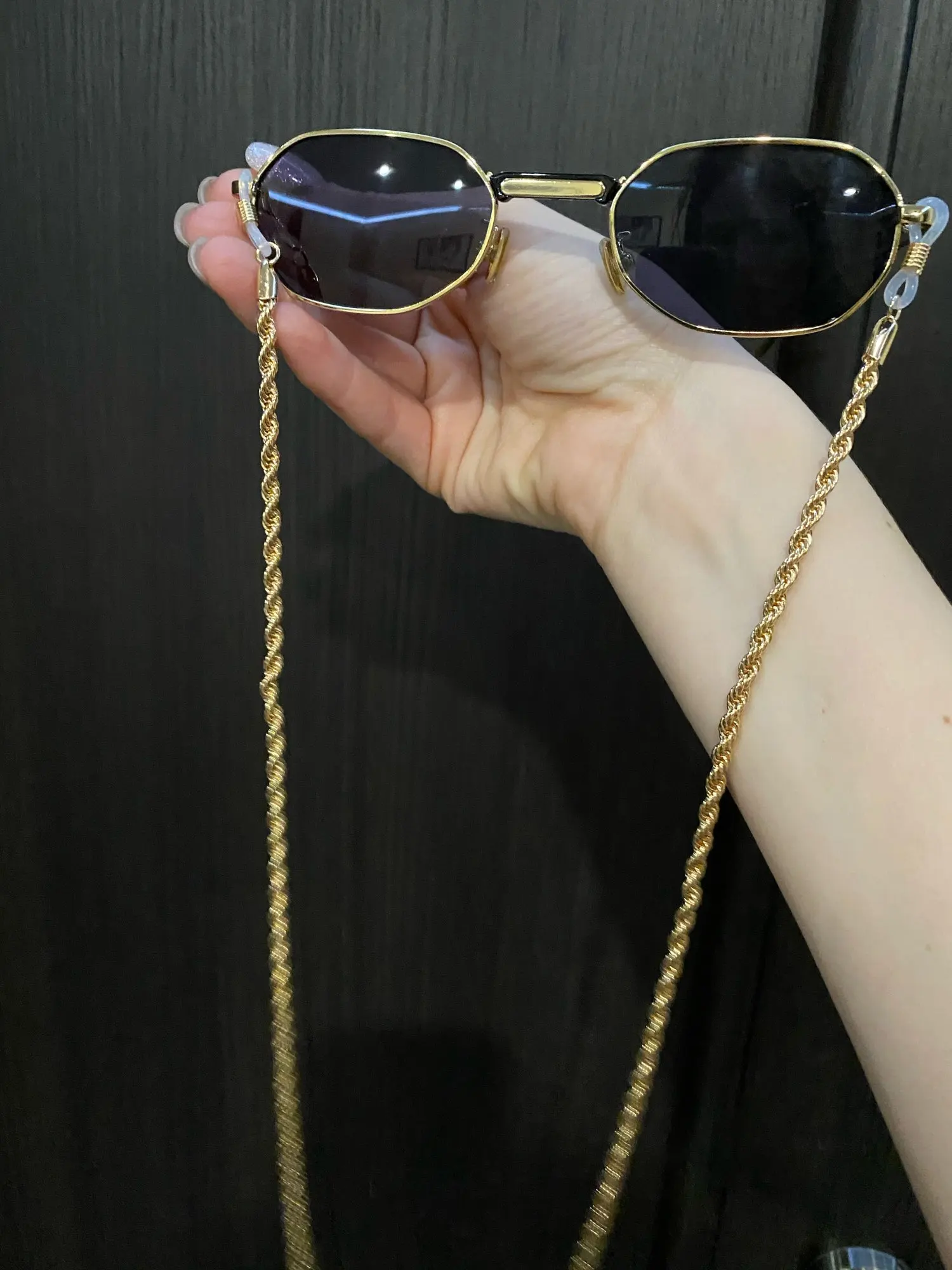 обыкновенная,крупная,крученная цепочка,советую,но она быстро потемнеет,но у меня на очках чёрная оправа,даже будет красивее