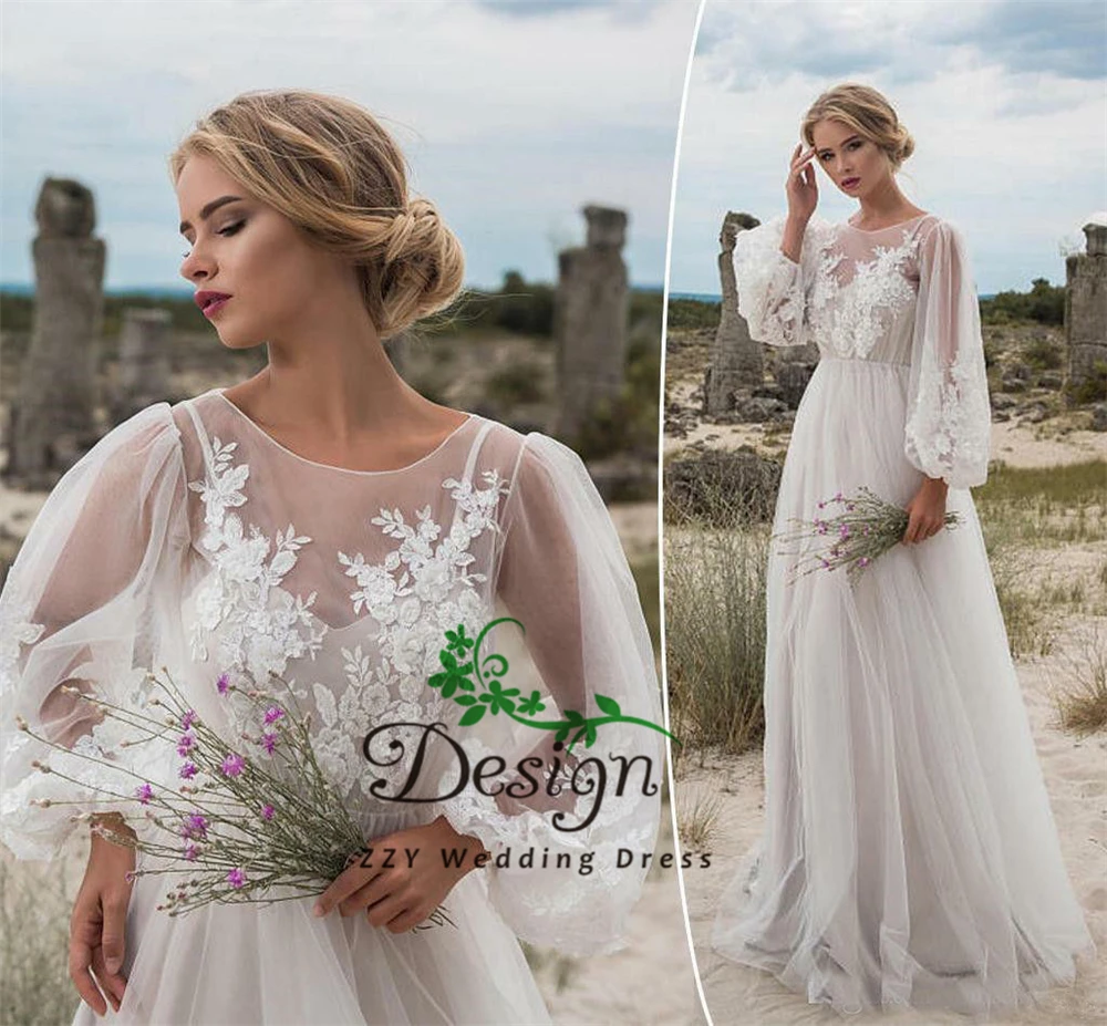 Свадебные платья цвета слоновой кости с длинными рукавами, иллюзия, тюль с длинным рукавом, Аппликации, естественная талия, Пляжное свадебное платье на заказ, 2019