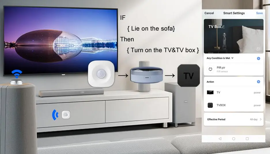 С помощью этого универсального ИК-пульта дистанционного управления вы можете использовать свой мобильный телефон для управления бытовой техникой, такой как STB (приставка), TV Box, TV, кондиционер, вентилятор, DVD. Совместим с большинством брендов на рынке, для получения подробной информации обратитесь к списку поддерживаемых брендов в приложении. Кроме того, он имеет функцию обучения, позволяет Копировать ключевую функцию оригинального пульта дистанционного управления в приложение (Настройка кнопок в приложении Tuya Smart).Примечание: Не совместим с бытовой техникой, в которой используется пульт дистанционного управления RF или bluetooth.