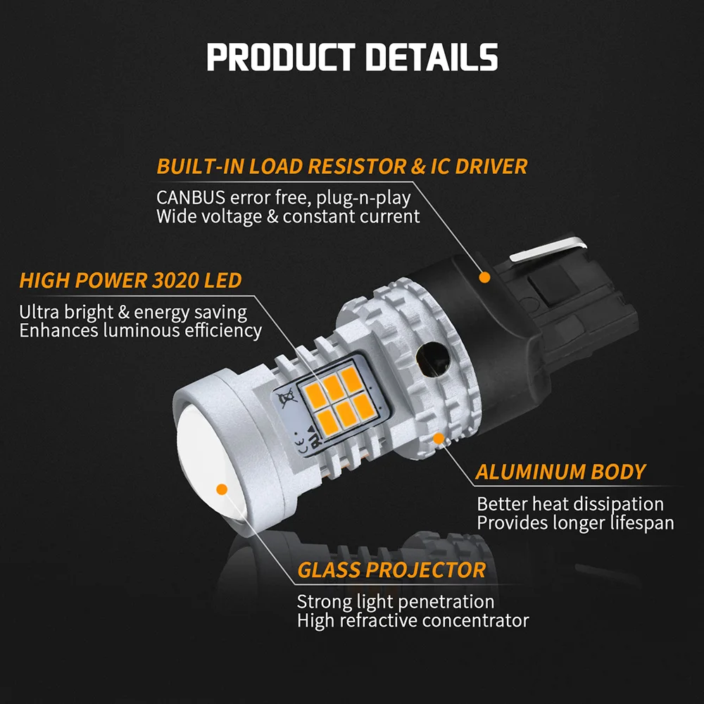 Интерфейс: W21W 7440Ток: 2АМощность: 21 ВтЛюмен: 1350лм(Чип на плате) Срок службы: 30000-50000 часовРабочее напряжение: 12-24 В постоянного тока (подходит только для автомобиля 12 В)Цвет освещения: 2200K ЯнтарныйСветильник: 26 шт. 3020SMDГарантия: 1 год