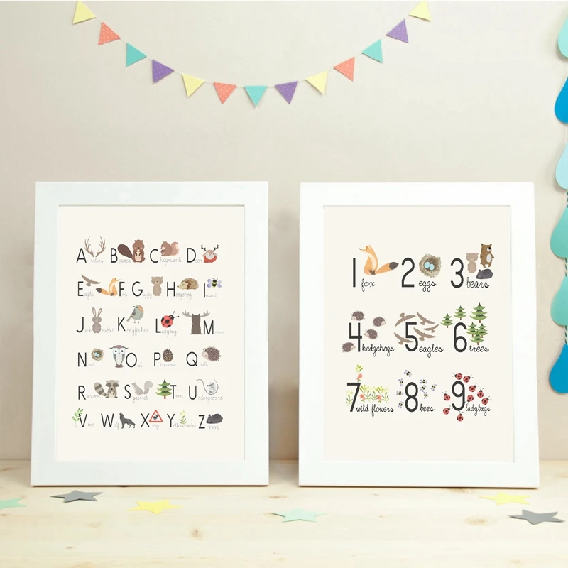 Лесной алфавит и цифры, развивающие плакаты и принты, Детская настенная живопись, холст, картины, детская комната, Настенный декор