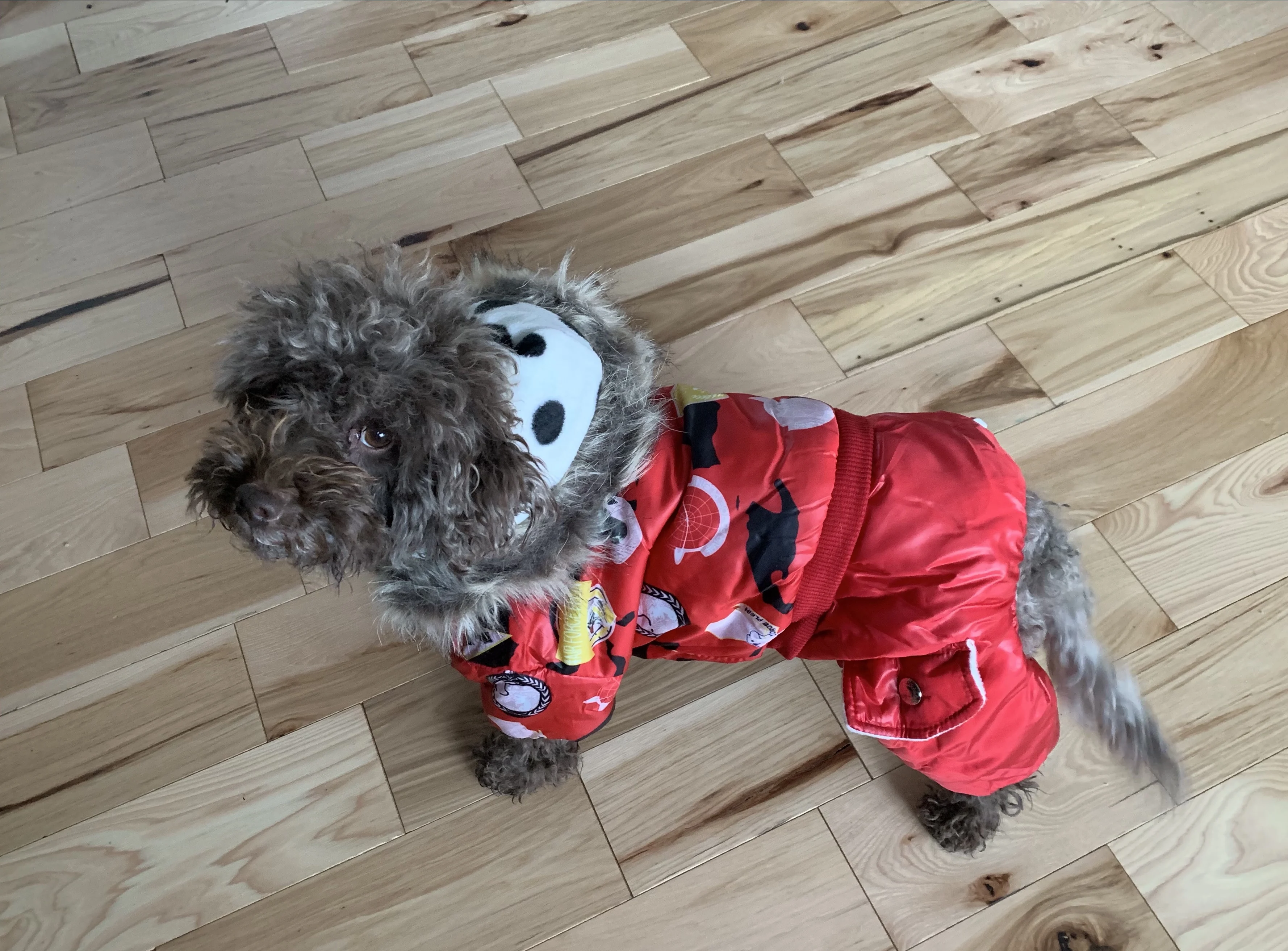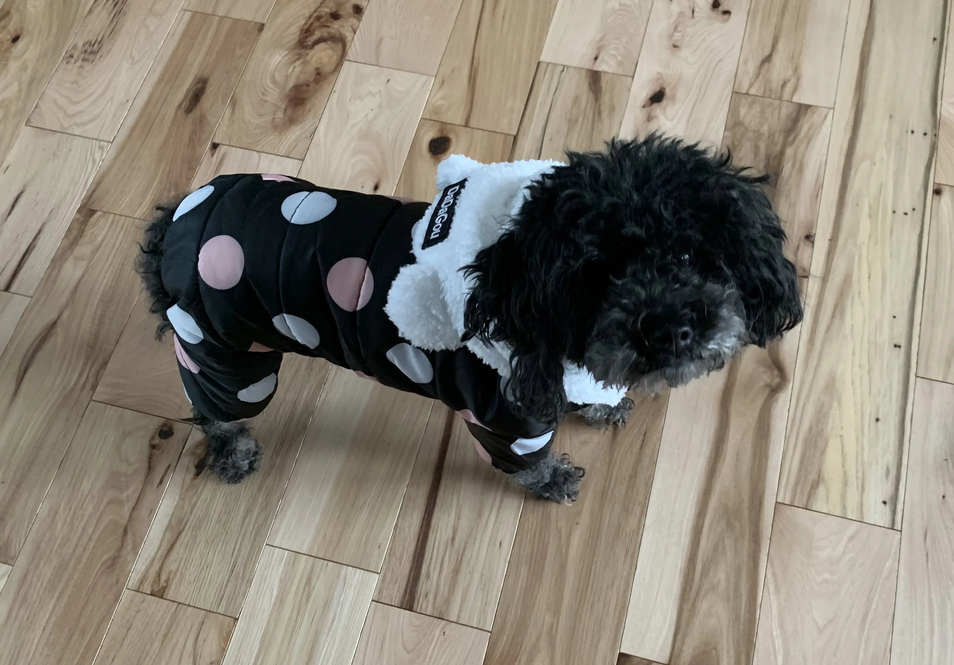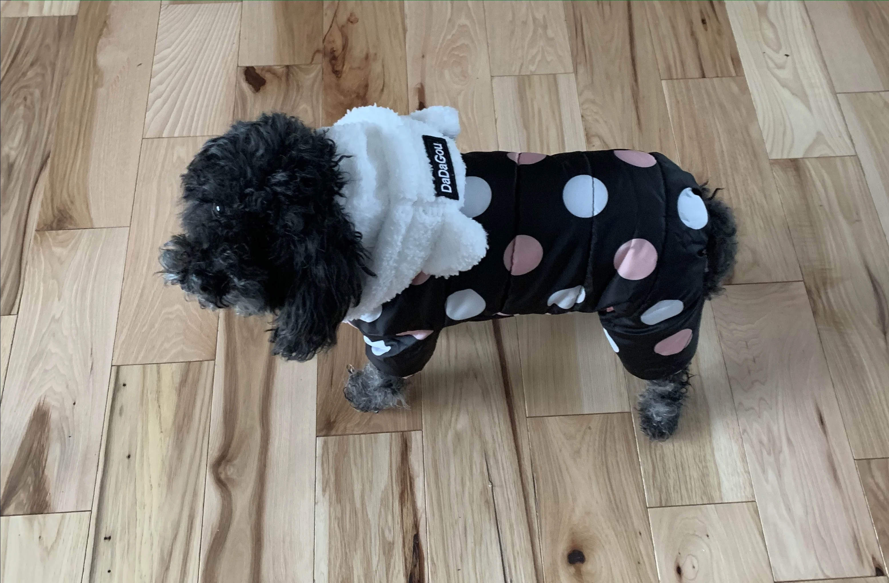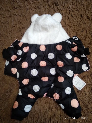 Отличная доставка до Украины за 17 дней Новой почтой. Пришло в объединенной посылке, лежал в простом пакете , все целое. Качество хорошее. Размер к сожалению не подошёл, заказывали XXL. По длине и объему нормально, а вот для лап маленький. Надпись на капюшоне вверх ногами. Заказывал не себе, так что фото на собаке нет. Собака Лхаский апсо. Вес собаки 7,7кг.