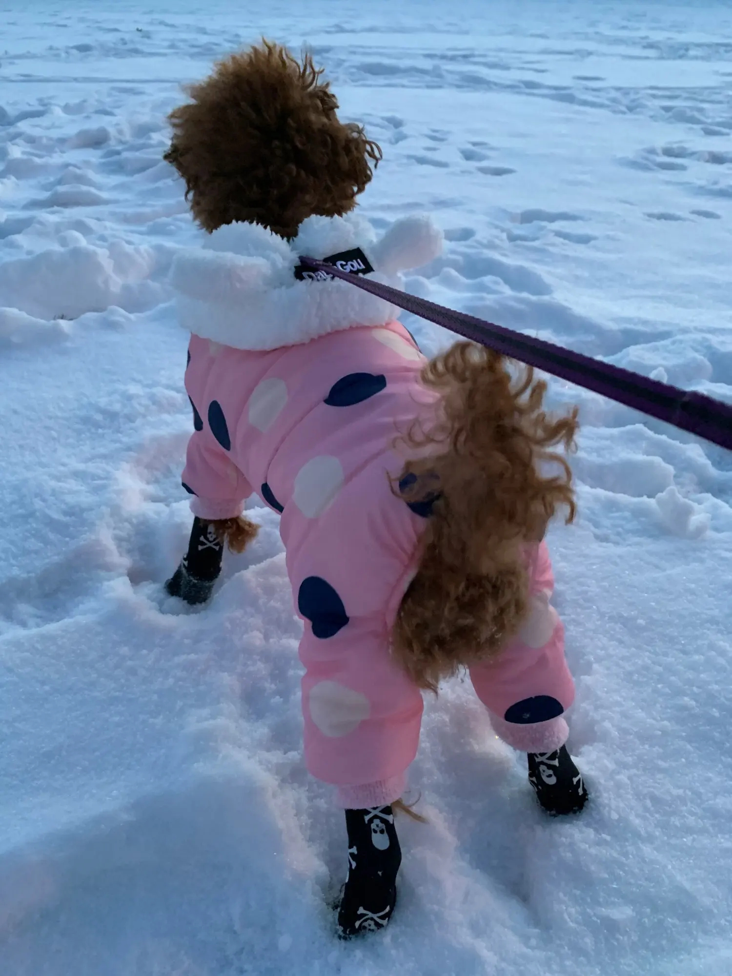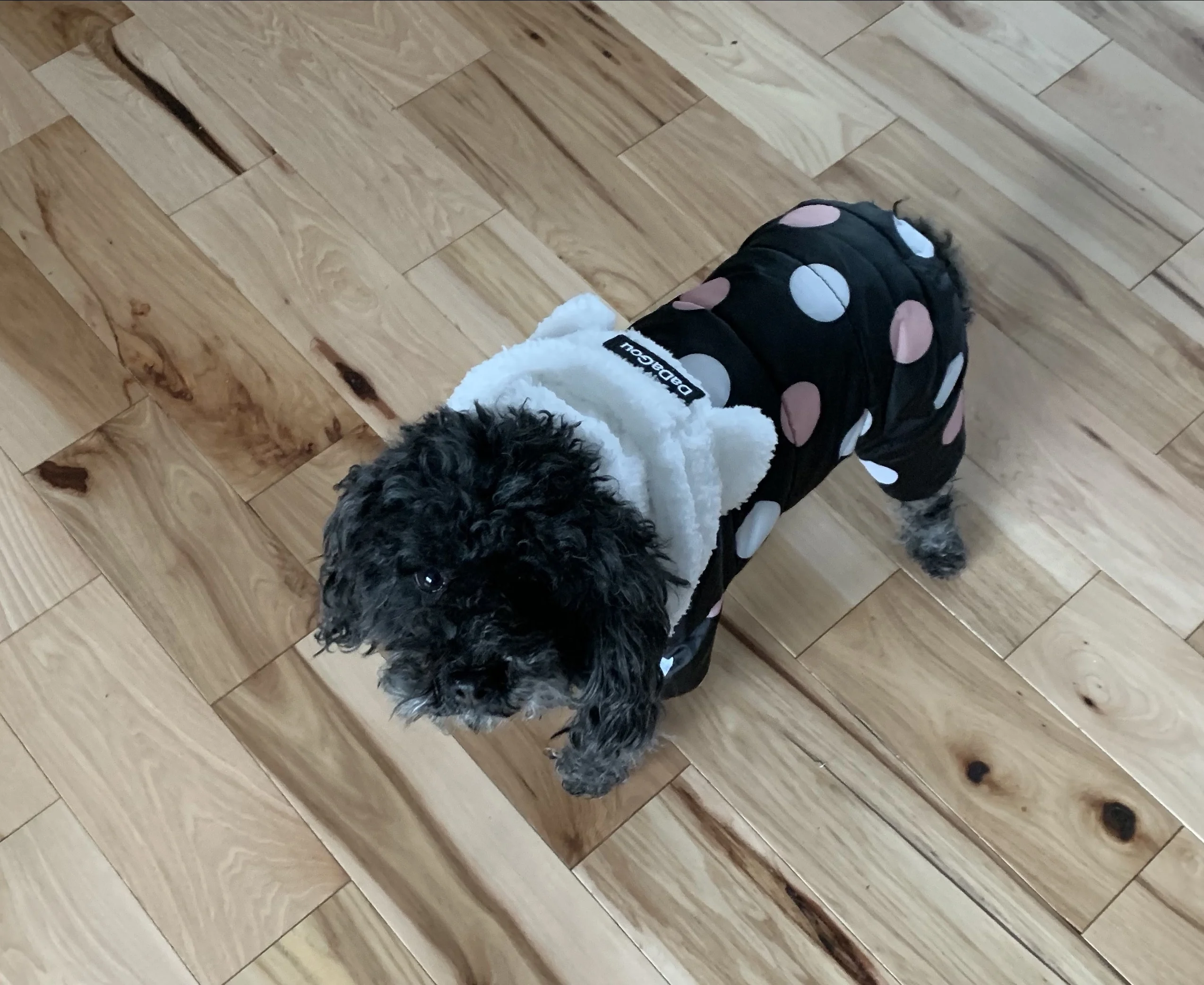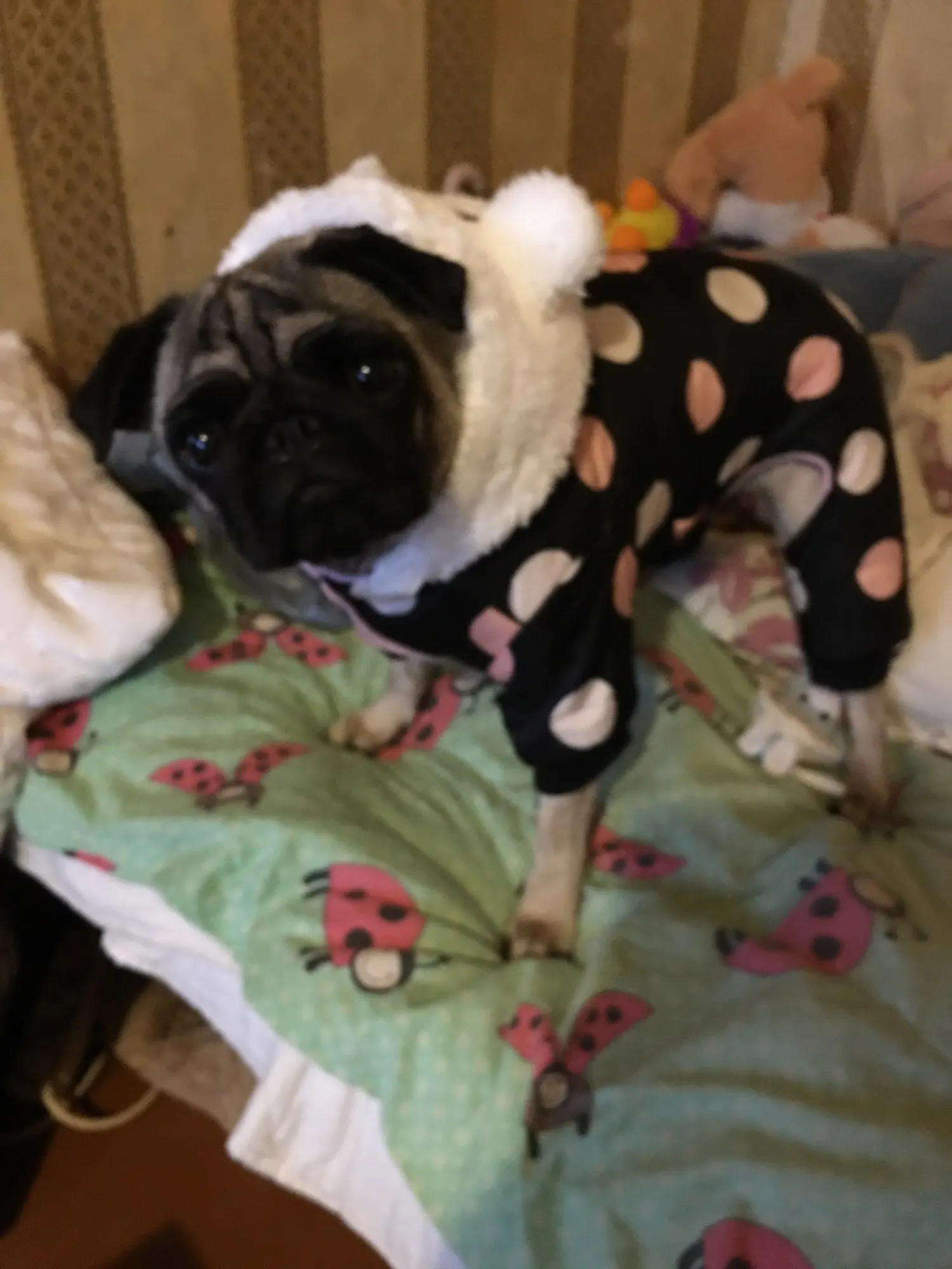 Комбезик классный, мягкий, нитки не торчат. Брала размер S на померанского шпица, немоого сковывает движение, из- за того что лапки короткие, а так - круто.