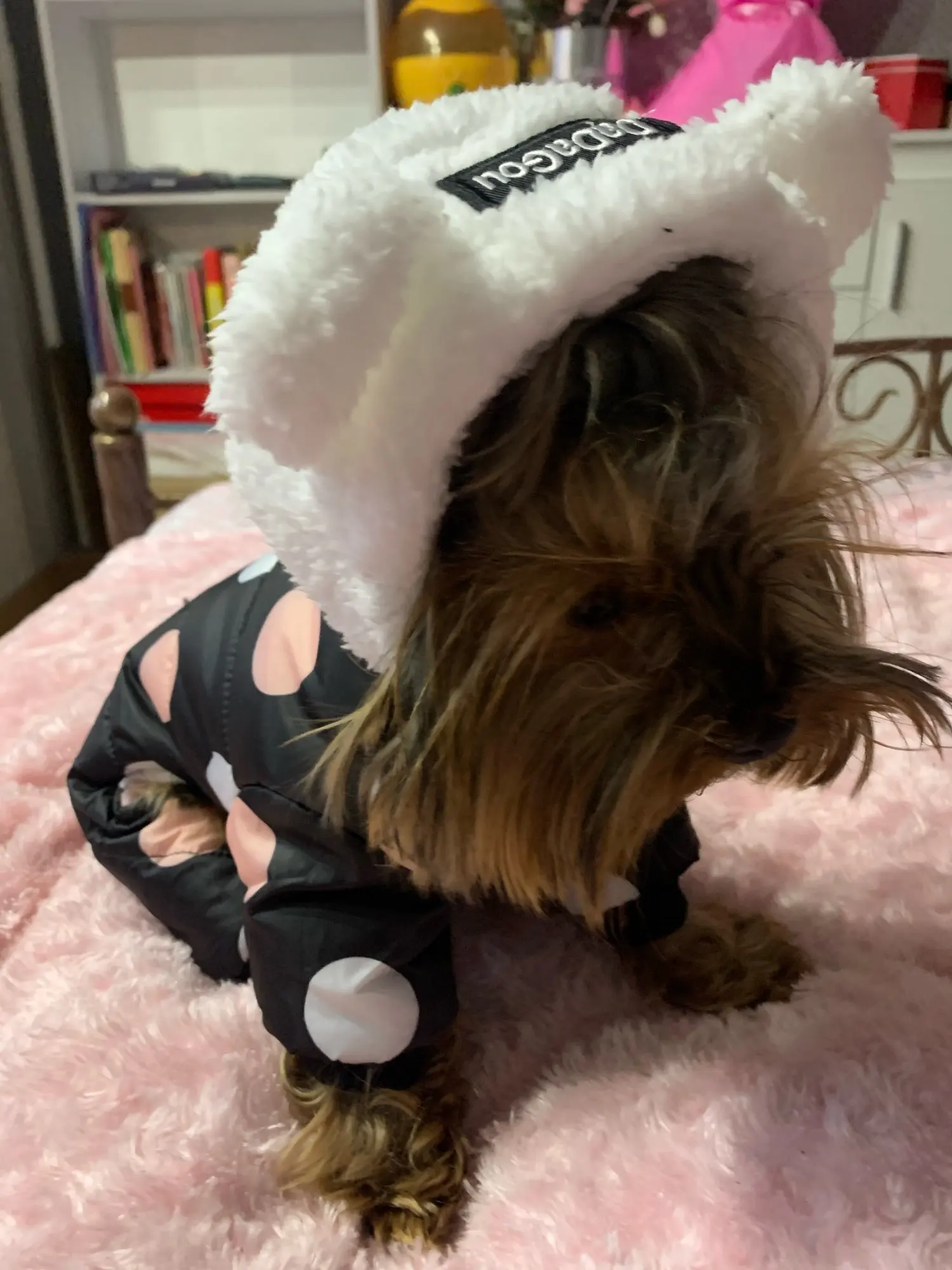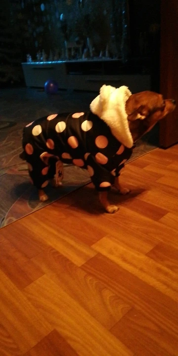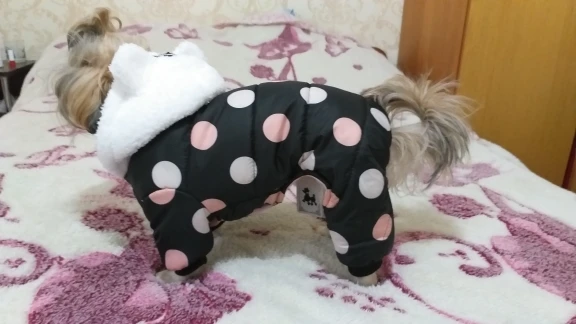 Костюм отличный, все подошло на Йорка 4 кг брала размер л по спинке 30 см. Сел хорошо, единственное что капюшон падает на морду пришлось приметать его.