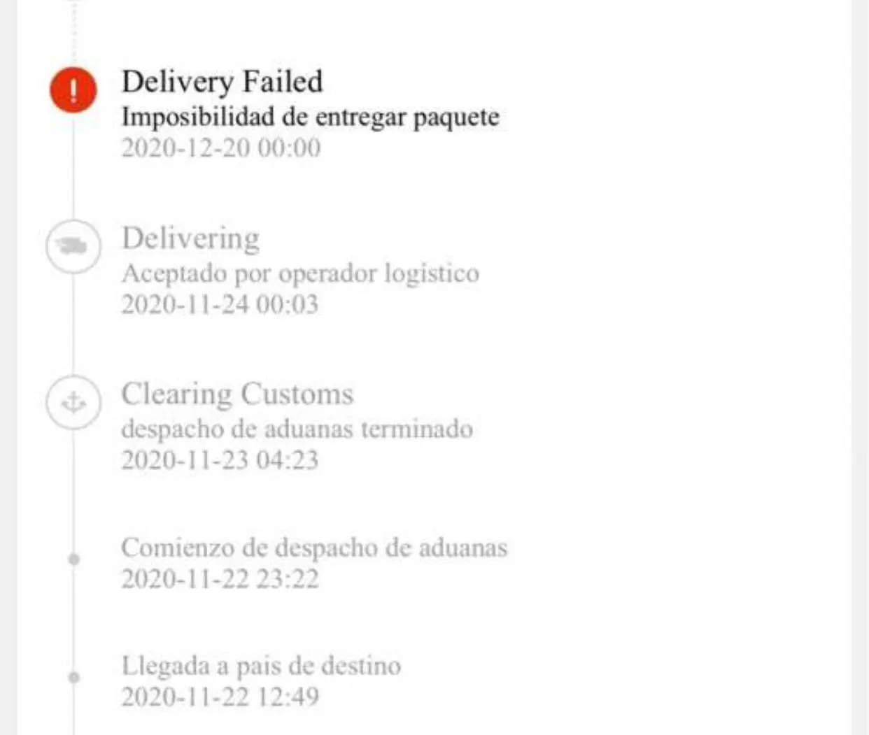 No he recibido nada y no me han devuelto mi dinero. Me dicen que me ponga en contacto con la oficina de correos, cuando pone claramente que mi pedido no se ha podido entregar. Envío captura de fotos a AliExpress abriendo disputa, y me dicen lo mismo, que me ponga en contacto con la oficina de correos. Llamo a correos y me dicen que ese número no corresponde al número de seguimiento de ellos, que cuando llega ellos le ponen uno nuevo. Hoy me encuentro que han cerrado disputa y le han pagado al vendedor, después de enviarle los pantallazos con la evidencia y el seguimiento... what??? Ahora estoy a la espera de que AliExpress se ponga en contacto conmigo... Son 6/7 €, pero aunque fuera 1... no me gusta que me roben ni que me estafen. Y AliExpress ya tendría que haber mediado y devuelto mi dinero.
