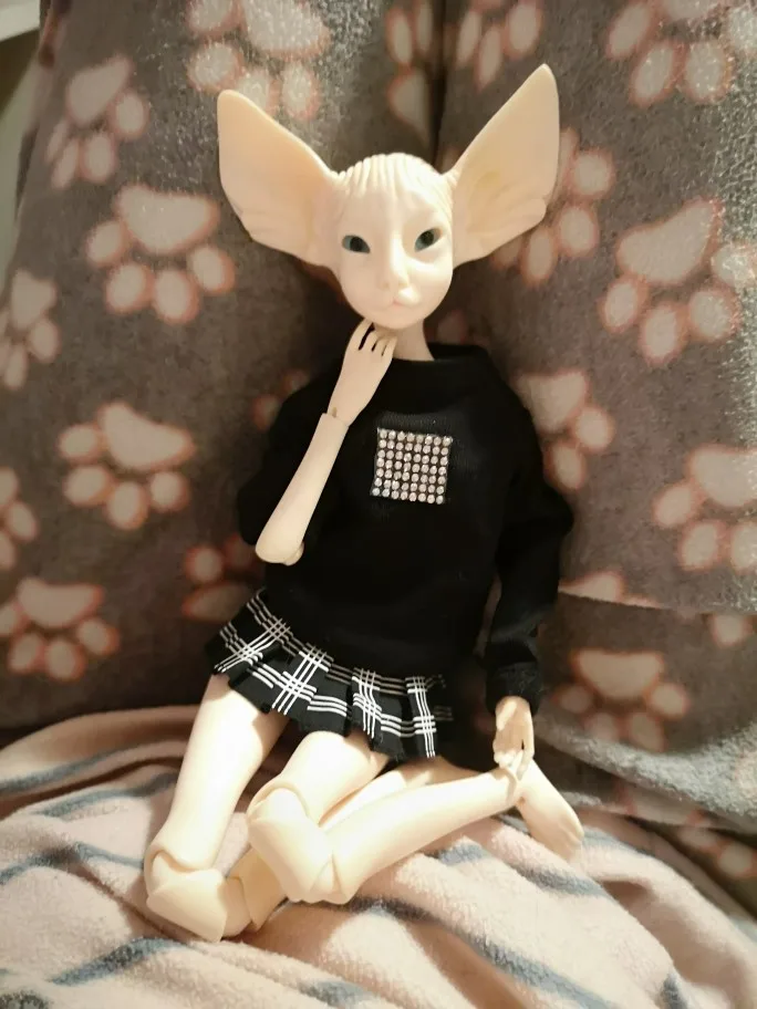 Хороший набор для пуллипа. На фотографиях я использую кукла 1/4. Все хорошо сшито, без завязок. Нет запахов. Тапочки обрезаны шнуром, вы не можете завязать. Джерси приклеила квадрат со стразами, выглядит немного уродливым, возможно, я удалю изделие. Шляпа большого размера для головы пуллипа/блэйта.