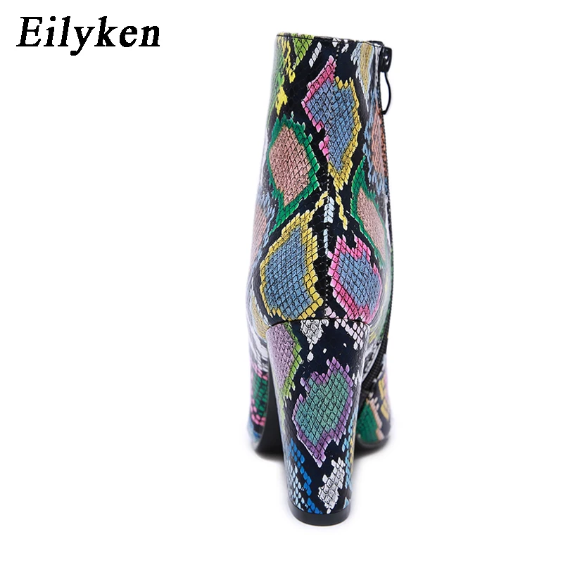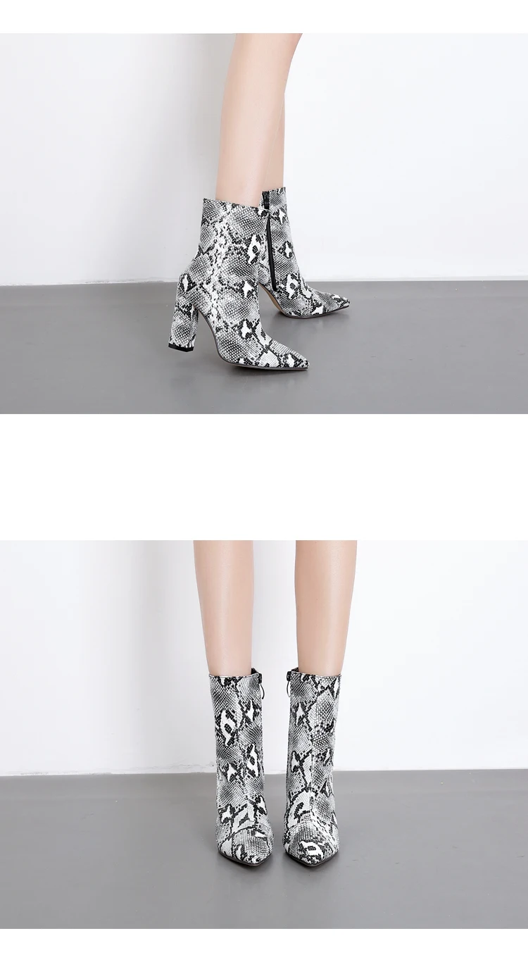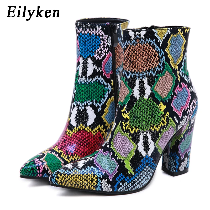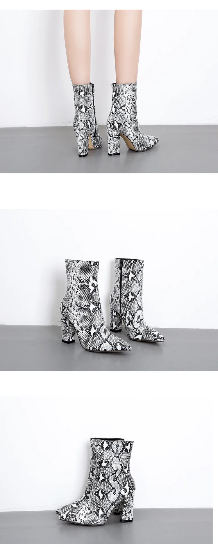 EilyKenновые модные ботинки со змеиным узором; Женские ботинки на толстом высоком каблуке; Ботильоны с острым носком на молнии; Женские повседневные зимние ботинки