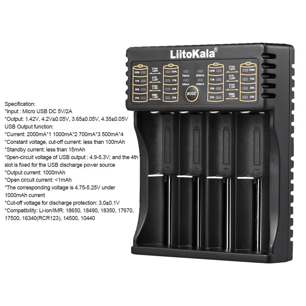 Индикатор выхода USB: когда обнаружится порт разрядки USB, индикатор громкости батареи будет светильник в течение 10 секунд и выйти из строя, нажмите кнопку, чтобы снова включить светильник.Светодиодный графический дисплей. Параметры Nput: Micro USB DC 5V/2A.Выход: 1,42 V/2V ± 0,05 V/3,65 ± 0,05 V/4,35 ± 0,05 V.Ток: 2000ма * 1 1000мА * 2 700мА * 3 500мА * 4.Постоянное напряжение, ток отключения: менее 100 мА · ч.Ток в режиме ожидания: менее 15 мА · ч. 0pen-circuit напряжение ток на выходе USB: 4,9-5,3 V; 4th Разъем предназначен для источника питания разряжения USB.Выходной ток: 1000 мАч.Ток открытого замыкания: <1 мА · ч.Соответствующее напряжение составляет 4,75-5,25 в до 1000 мА · ч тока.Критическое напряжение для защиты от разряжения: 3,0 ± 0,1 V.Совместимость: для li-ion / IMR: 18650, 18490, 18350, 17670, 17500, 16340(RCR123), 14500, 10440Совместимость: li-ion/IMR: 18650, 18490, 18350, 17670, 17500, 16340(RCR123), 14500, 10440. Посылка включает в себя:1 * зарядное устройство для 18650 26650 16340 14500 4 слота.1 * кабель.1 * руководство.
