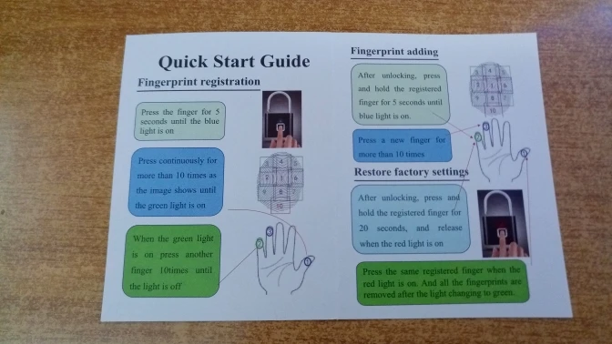 Замок норм, приятный на вид, хоть и кажется хлипеньким. Пришёл быстро, всюду отслеживался. Не сразу я разобрался с настройкой, но к счастью есть простая функция возврата к заводским установкам, после чего можно начинать регистрацию отпечатков с нуля. В итоге за несколько минут настроил датчик под себя. Всё работает, зарегистрированные пальцы узнаёт, остальные игнорит. Товар и продавца рекомендую.