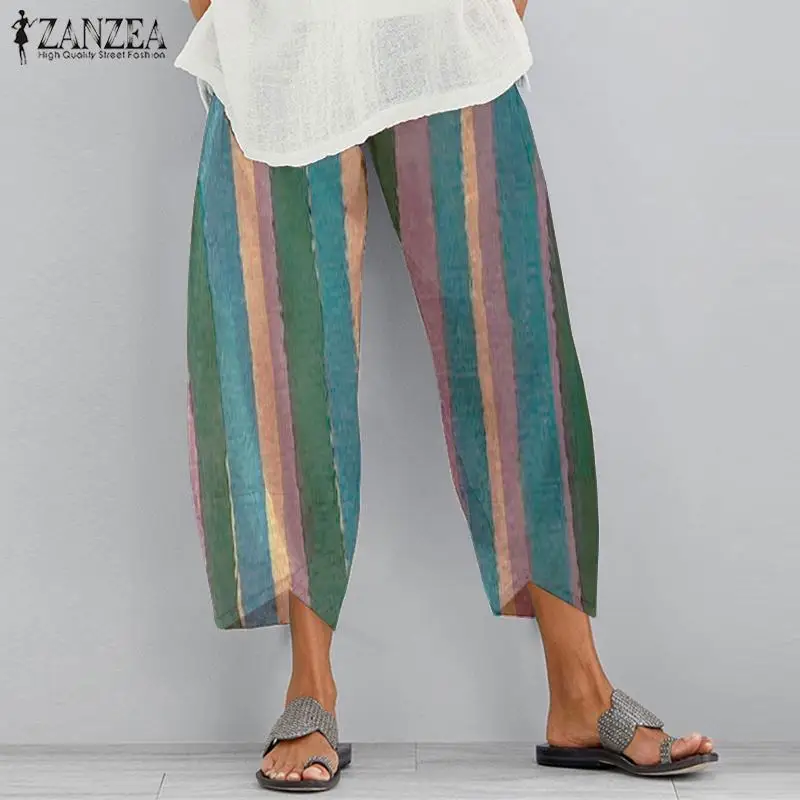 Винтажные льняные штаны ZANZEA, женские летние брюки, повседневные, с эластичной талией, асимметричные, женские укороченные штаны, большого размера