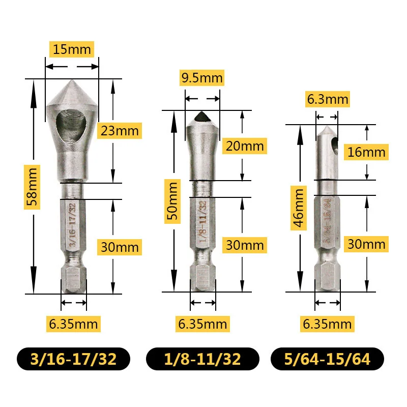 Набор сверл с шестигранной зенковкой, 3 шт., 6,35 мм, из быстрорежу...