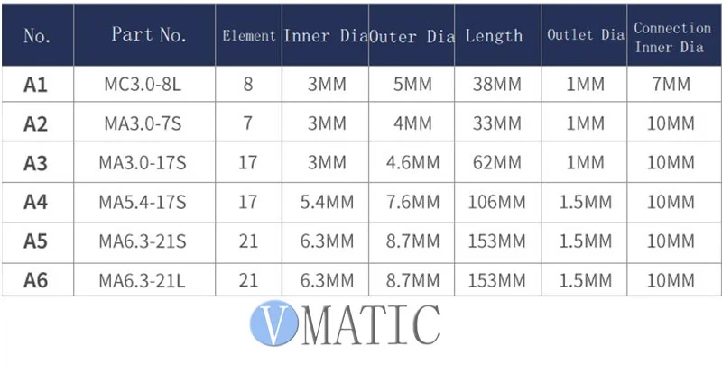 Часть №. I.D.(мм) О. Д. (мм) Элементы Общая длина (мм) MA3.0-07S 3 4,6 7 33,2 MA3.0-8S 3 4 8 33 MA3.0-8L 3 5 8 38 MA3.0-17S 3 4,6 17 62 MA5.4-17S 5,4 7,6 17 106 MA6.0-21S 6 8,7 21 153 MA6.3-12S 6,3 8,7 12 97 MA6.3-21S 6,3 8,7 21 153Стандартная экспортная картонная упаковка.