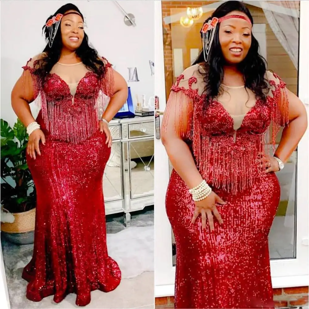 Aso Ebi арабское бордовое вечернее платье с блестками 2021 Прозрачное платье с воротником и бусинами Русалка для выпускного вечера с бахромой